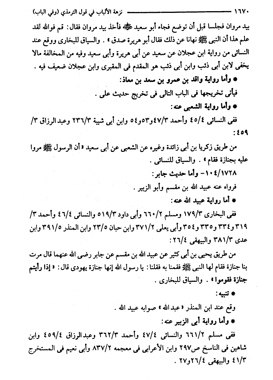 من طريق زكريا بن أبى زائدة وغيره عن الشعبى عن أبى سعيد "أن الرسول - صلى الله عليه وسلم - مروا عليه بجنازة فقام". والسياق للنسائي.
