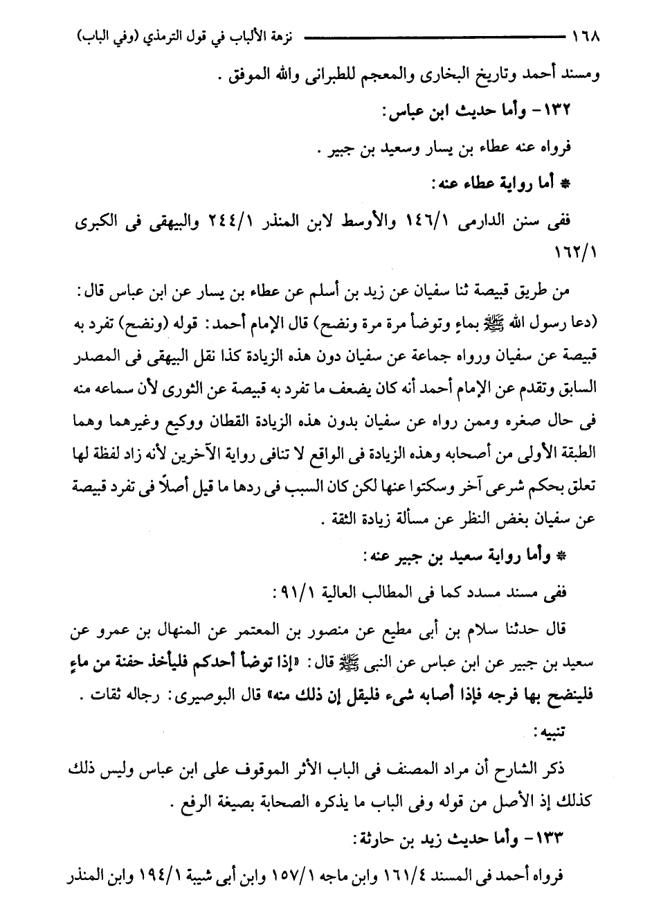 من طريق قبيصة ثنا سفيان عن زيد بن أسلم عن عطاء بن يسار عن ابن عباس قال: (دعا رسول الله - صلى الله عليه وسلم - بماءٍ وتوضأ مرة مرة ونضح) قال الإمام أحمد: قوله (ونضح) تفرد به قبيصة عن سفيان ورواه جماعة عن سفيان دون هذه الزيادة كذا نقل البيهقي في المصدر السابق وتقدم عن الإمام أحمد أنه كان يضعف ما تفرد به قبيصة عن الثورى لأن سماعه منه في حال صغره وممن رواه عن سفيان بدون هذه الزيادة القطان ووكيع وغيرهما وهما الطبقة الأولى من أصحابه وهذه الزيادة في الواقع لا تنافى رواية الآخرين لأنه زاد لفظة لها تعلق بحكم شرعى آخر وسكتوا عنها لكن كان السبب في ردها ما قيل أصلًا في تفرد قبيصة عن سفيان بغض النظر عن مسألة زيادة الثقة.