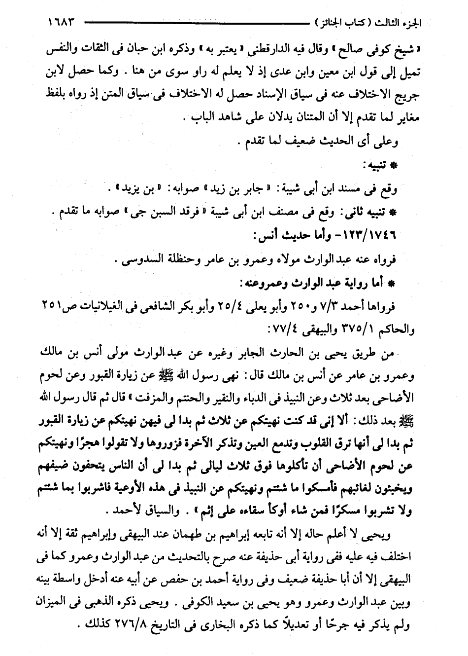 وعمرو بن عامر عن أنس بن مالك قال: نهى رسول الله - صلى الله عليه وسلم - عن زيارة القبور وعن لحوم الأضاحى بعد ثلاث وعن النبيذ في الدباء والنقير والحنتم والمزفت" قال ثم قال رسول الله - صلى الله عليه وسلم - بعد ذلك: ألا إنى قد كنت نهيتكم عن ثلاث ثم بدا لى فيهن نهيتكم عن زيارة القبور ثم بدا لى أنها ترق القلوب وتدمع العين وتذكر الآخرة فزوروها ولا تقولوا هجرًا ونهيتكم عن لحوم الأضاحى أن تأكلوها فوق ثلاث ليالى ثم بدا لى أن الناس يتحفون ضيفهم ويخبئون لغائبهم فأمسكوا ما شئتم ونهيتكم عن النبيذ في هذه الأوعية فاشربوا بما شئتم ولا تشربوا مسكرًا فمن شاء أوكأ سقاءه على إثم". والسياق لأحمد.