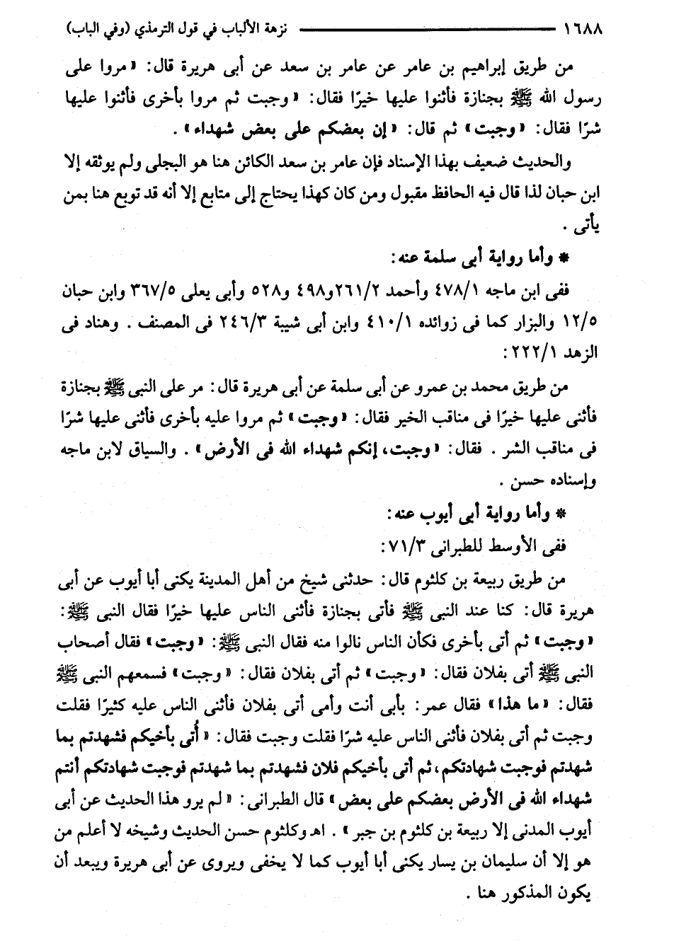 من طريق إبراهيم بن عامر عن عامر بن سعد عن أبى هريرة قال: "مروا على رسول الله - صلى الله عليه وسلم - بجنازة فأثنوا عليها خيرًا فقال: "وجبت ثم مروا بأخرى فأثنوا عليها شرًا فقال: "وجبت" ثم قال: "إن بعضكم على بعض شهداء".