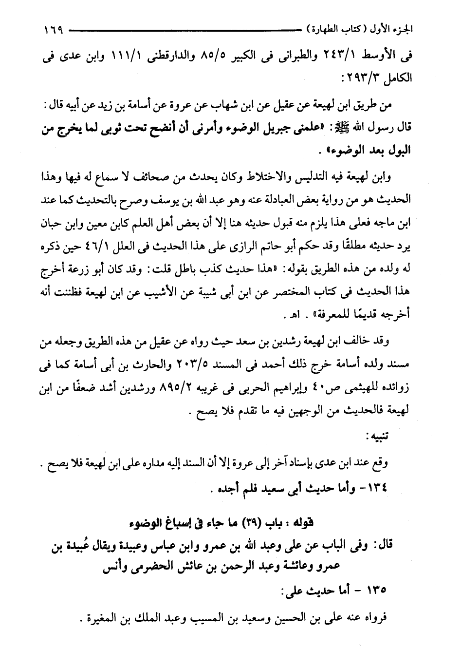 من طريق ابن لهيعة عن عقيل عن ابن شهاب عن عروة عن أسامة بن زيد عن أبيه قال: قال رسول الله - صلى الله عليه وسلم -: "علمنى جبريل الوضوء وأمرنى أن أنضح تحت ثوبى لما يخرج من البول بعد الوضوء".