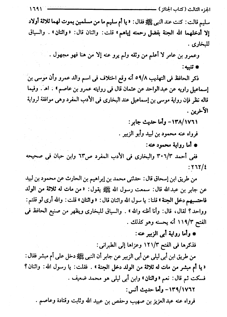 من طريق ابن أبى ليلى عن أبى الزبير عن جابر أن النبي - صلى الله عليه وسلم - دخل على أم مبشر فقال: "يا أم مبشر من مات له ثلاثة من الولد دخل الجنة". فقلت: يا رسول الله: واثنان؟ فسكت ثم قال: نعم "واثنان" وابن أبى ليلى هو محمد ضعيف.