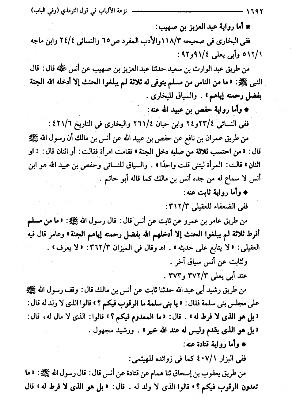 من طريق يعقوب بن إسحاق ثنا همام عن قتادة عن أنس قال: قال رسول الله - صلى الله عليه وسلم -: "ما تعدون الرقوب فيكم؟ " قالوا الذى لا ولد له. قال: "بل هو الذى لا فرط له" قال