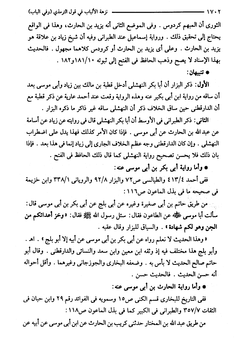 الثانى: ذكر الطبراني في الأوسط أن أبا بكر النهشلى قال في روايته عن زياد عن أسامة عن عبد الله بن الحارث عن أبى موسى. فإذا كان الأمر كذلك فهذا يدل على اضطراب النهشلى. وإن كان الدارقطني وجه عظم الخلاف الجارى إلى زياد إنما في هذا بعد. فإذا بأن ذلك فلا يحسن تصحيح رواية النهشلى كما قال ذلك الحافظ في الفتح.