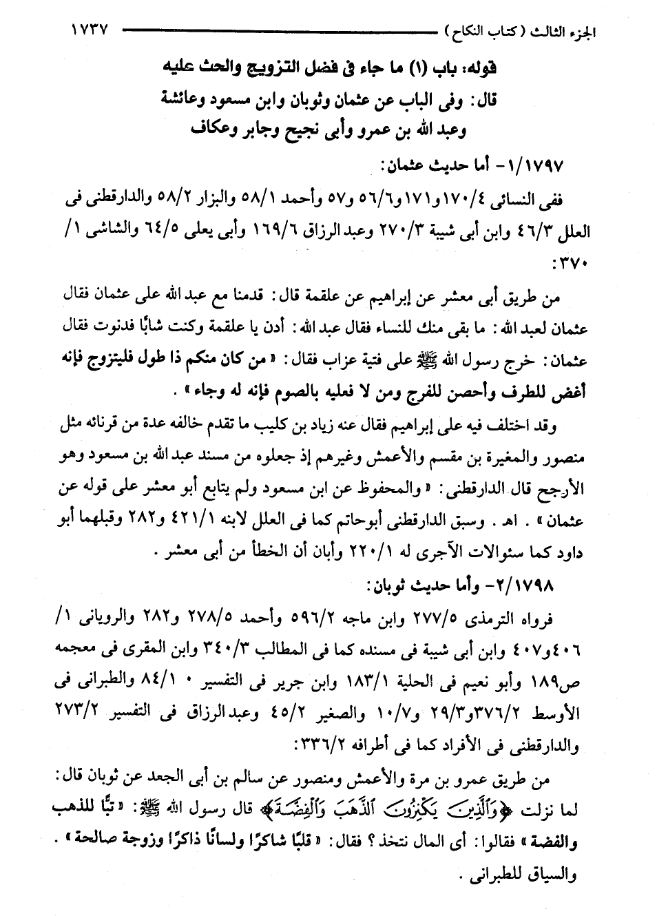من طريق أبى معشر عن إبراهيم عن علقمة قال: قدمنا مع عبد الله على عثمان فقال عثمان لعبد الله: ما بقى منك للنساء فقال عبدالله: ادن يا علقمة وكنت شابًّا فدنوت فقال عثمان: خرج رسول الله - صلى الله عليه وسلم - على فتية عزاب فقال: "من كان منكم ذا طول فلينزوج فإنه أغض للطرف وأحصن للفرج ومن لا فعليه بالصوم فإنه له وجاء".