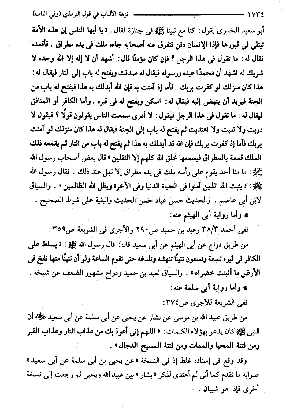 أبو سعيد الخدرى يقول: كنا مع نبينا - صلى الله عليه وسلم - في جنازة فقال: "يا أيها الناس إن هذه الأمة تبتلى في قبورها فإذا الإنسان دفن فتفرق عنه أصحابه جاء. ملك في يده مطراق. فأقعده فقال له: ما تقول في هذا الرجل؟ فإن كان مؤمنًا قال: أشهد أن لا إله إلا الله وحده لا شريك له اشهد أن محمدًا عبده ورسوله فيقال له صدقت ويفتح له باب إلى النار فيقال له: هذا كان منزلك لو كفرت بربك. فأما إذ آمنت به فإن الله أبدلك به هذا فيفتح له باب من الجنة فيريد أن ينهض إليه فيقال له: اسكن ويفتح له في قبره. وأما الكافر أو المنافق فيقال له: ما تقول في هذا الرجل فيقول: لا أدرى سمعت الناس يقولون قولًا؟ فيقول لا دريت ولا تليت ولا اهتديت ثم يفتح له باب إلى الجنة فيقال له هذا كان منزلك لو أمنت بربك فأما إذ كفرت بربك فإن الله قد أبدلك به هذا ثم يفتح له باب من النار ثم يقمعه ذلك الملك قمعة بالمطراق فيسمعها خلق الله كلهم إلا الثقلين" قال بعض أصحاب رسول الله - صلى الله عليه وسلم -: ما منا أحد يقوم على رأسه ملك في يده مطراق إلا نهل عند ذلك. فقال رسول الله - صلى الله عليه وسلم -: "يثبت الله الذين آمنوا في الحياة الدنيا وفى الآخرة ويضل الله الظالمين". والسياق لابن أبي عاصم. والحديث حسن عباد حسن الحديث والبقية على شرط الصحيح.