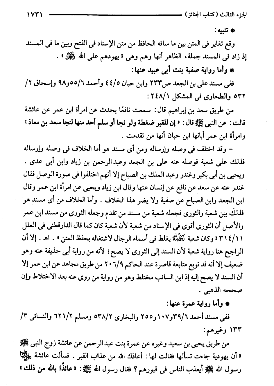 - وقد اختلف في وصله وإرساله ومن أي مسند هو أما الخلاف في وصله وإرساله فذلك على شعبة فوصله عنه على بن الجعد وعبد الرحمن بن زياد وابن أبى عدى. ويحيى بن أبى بكير وغندر وعبد الملك بن الصباح إلا أنهم اختلفوا في صورة الوصل فقال غندر عنه عن سعد عن نافع عن إنسان عنها وقال ابن زياد ويحيى عن امرأة ابن عمر وقال ابن الجعد وابن الصباح عن صفية ولا يضر هذا الخلاف. وأما الخلاف من أي مسند هو فذلك بين شعبة والثورى فجعله شعبة من مسند من تقدم وجعله الثورى من مسند ابن عمر والأصل أن الثورى أقوى في الإسناد من شعبة لأن شعبة كان كما قال الدارقطني في العلل 11/ 314 "وكان شعبة -رحمه الله- يغلط في أسماء الرجال لاشتغاله بحفظ المتن". اهـ. إلا أن الراجح هنا رواية شعبة لأن السند إلى الثورى لا يصح؛ لأنه من رواية أبى حذيفة عنه وهو ضعيف إلا أنه قد توبع متابعة قاصرة عند الحاكم 9/ 206 من طريق مجاهد عن ابن عمر إلا أن السند لا يصح إليه إذ ابن السائب مختلط وهو من رواية من روى عنه بعد الاختلاط وإن صححه الذهبى.
