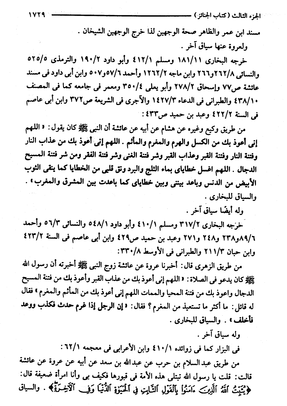 من طريق الزهرى قال: أخبرنا عروة عن عائشة زوج النبي - صلى الله عليه وسلم - أخبرته أن رسول الله - صلى الله عليه وسلم - كان يدعو في الصلاة: "اللهم إنى أعوذ بك من عذاب القبر وأعوذ بك من فتنة المسيح الدجال وأعوذ بك من فتنة المحيا والممات اللهم إنى أعوذ بك من المأثم والمغرم، فقال له قائل: ما أكثر ما تستعيذ من المغرم؟ فقال: "إن الرجل إذا غرم حدث فكذب ووعد فأخلف". والسياق للبخاري.
