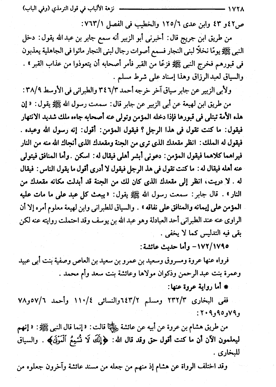 من طريق ابن جريج قال: أخبرنى أبو الزبير أنه سمع جابر بن عبد الله يقول: دخل النبي - صلى الله عليه وسلم - يومًا نخلاً لبنى النجار فسمع أصوات رجال لبنى النجار ماتوا في الجاهلية يعذبون في قبورهم فخرج النبي - صلى الله عليه وسلم - فزعًا من القبر فأمر أصحابه أن يتعوذوا من عذاب القبر". والسياق لعبد الرزاق وهذا إسناد على شرط مسلم.