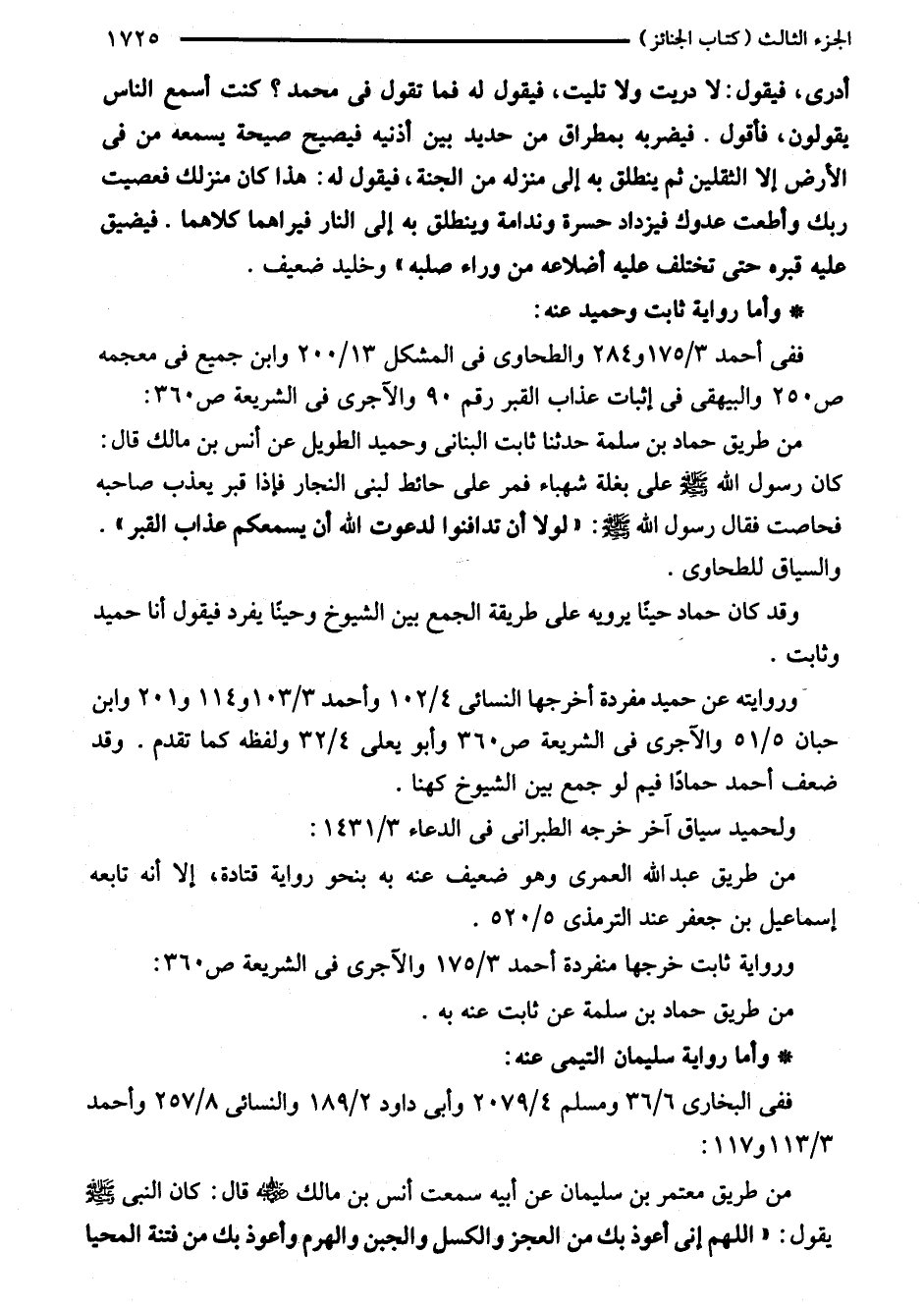 ففي أحمد 3/ 175 و 284 والطحاوى في المشكل 13/ 200 وابن جميع في معجمه ص 250 والبيهقي في إثبات عذاب القبر رقم 90 والآجرى في الشريعة ص 360: