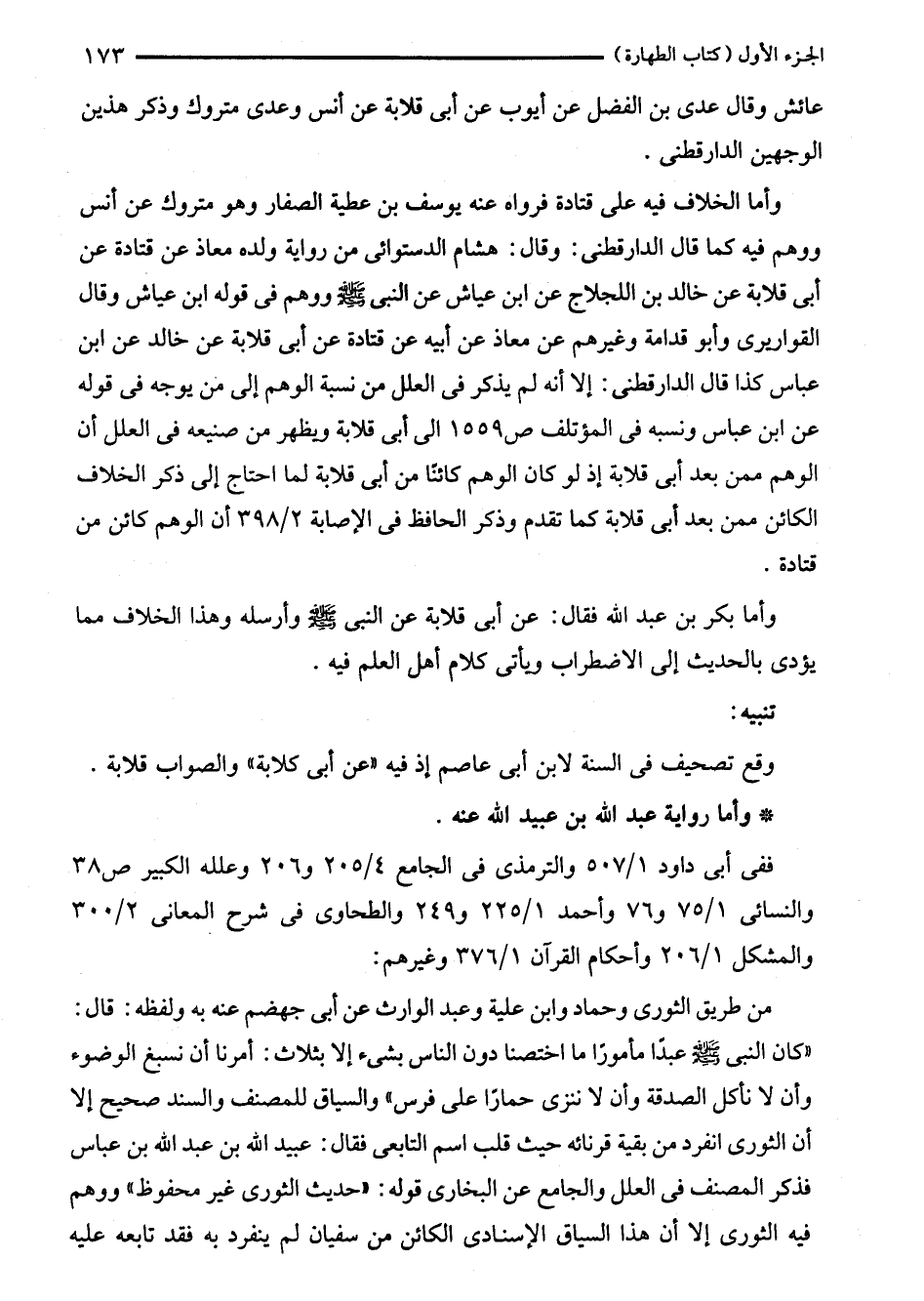 وأما الخلاف فيه على قتادة فرواه عنه يوسف بن عطية الصفار وهو متروك عن أنس ووهم فيه كما قال الدارقطني: وقال: هشام الدستوائى من رواية ولده معاذ عن قتادة عن أبى قلابة عن خالد بن اللجلاج عن ابن عياش عن النبي - صلى الله عليه وسلم - ووهم في قوله ابن عياش وقال القواريرى وأبو قدامة وغيرهم عن معاذ عن أبيه عن قتادة عن أبى قلابة عن خالد عن ابن عباس كذا قال الدارقطني: إلا أنه لم يذكر في العلل من نسبة الوهم إلى من يوجه في قوله عن ابن عباس ونسبه في المؤتلف ص 1559 الى أبى قلابة ويظهر من صنيعه في العلل أن الوهم ممن بعد أبى قلابة إذ لو كان الوهم كائنًا من أبى قلابة لما احتاج إلى ذكر الخلاف الكائن ممن بعد أبى قلابة كما تقدم وذكر الحافظ في الإصابة 2/ 398 أن الوهم كائن من قتادة.