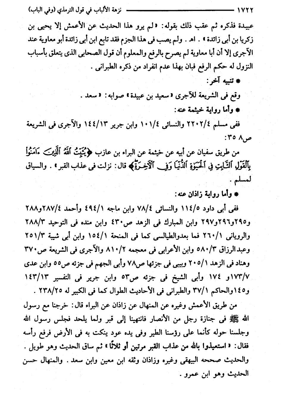 من طريق سفيان عن أبيه عن خيثمة عن البراء بن عازب {يُثَبِّتُ اللَّهُ الَّذِينَ آمَنُوا بِالْقَوْلِ الثَّابِتِ فِي الْحَيَاةِ الدُّنْيَا وَفِي الْآخِرَةِ} قال: نزلت في عذاب القبر". والسياق لمسلم.
