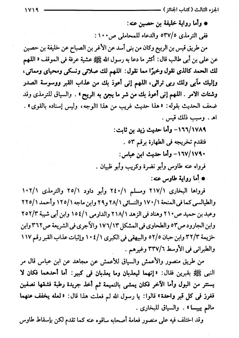 فرواها البخاري 1/ 217 ومسلم 1/ 240 وأبو داود 1/ 25 والترمذي 1/ 102 والطيالسى كما في المنحة 1/ 170 والنسائي 1/ 28 و 29 وابن ماجه 1/ 125 وأحمد 1/ 225 وعبد بن حميد ص 210 وهناد في الزهد 1/ 218 والدارمي 1/ 154 وابن أبى شيبة 3/ 252 وابن الجارود ص 53 والطحاوى في المشكل 13/ 176 والآجرى في الشريعة ص 362 وابن خزيمة 3/ 32 وابن حبان 5/ 52 والبيهقي في الكبرى 1/ 104 وإثبات عذاب القبر رقم 117 والطبراني في الأوسط 6/ 337 وغيرهم.