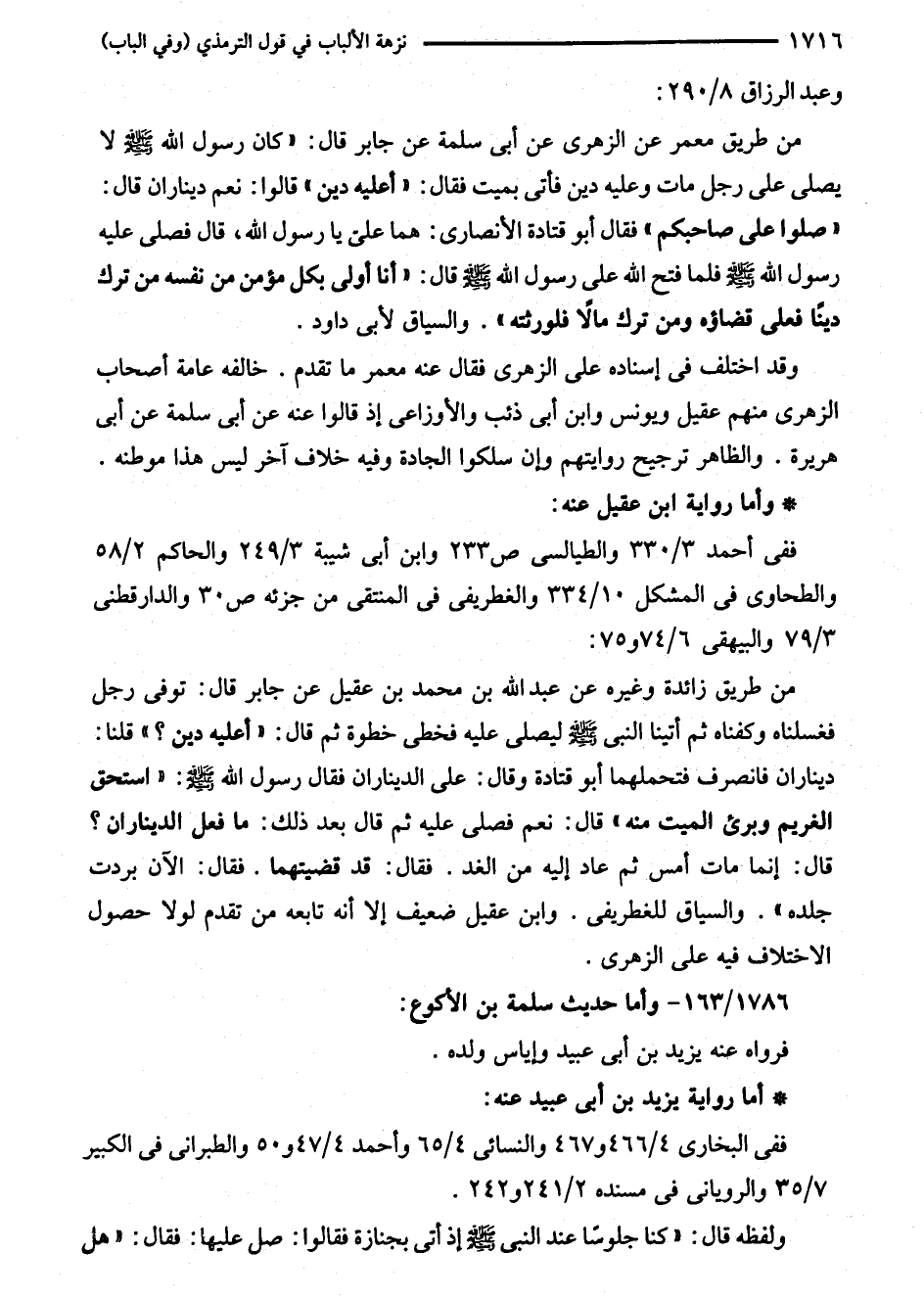 من طريق زائدة وغيره عن عبد الله بن محمد بن عقيل عن جابر قال: توفى رجل فغسلناه وكفناه شم أتينا النبي - صلى الله عليه وسلم - ليصلى عليه فخطى خطوة ثم قال: "أعليه دين؟ " قلنا: ديناران فانصرف فتحملهما أبو قتادة وقال: على الديناران فقال رسول الله - صلى الله عليه وسلم -: "استحق الغريم وبرئ الميت منه" قال: نعم فصلى عليه ثم قال بعد ذلك: ما فعل الديناران؟ قال: إنما مات أمس ثم عاد إليه من الغد. فقال: قد قضيتهما. فقال: الآن بردت جلده". والسياق للغطريفى. وابن عقيل ضعيف إلا أنه تابعه من تقدم لولا حصول الاختلاف فيه على الزهرى.