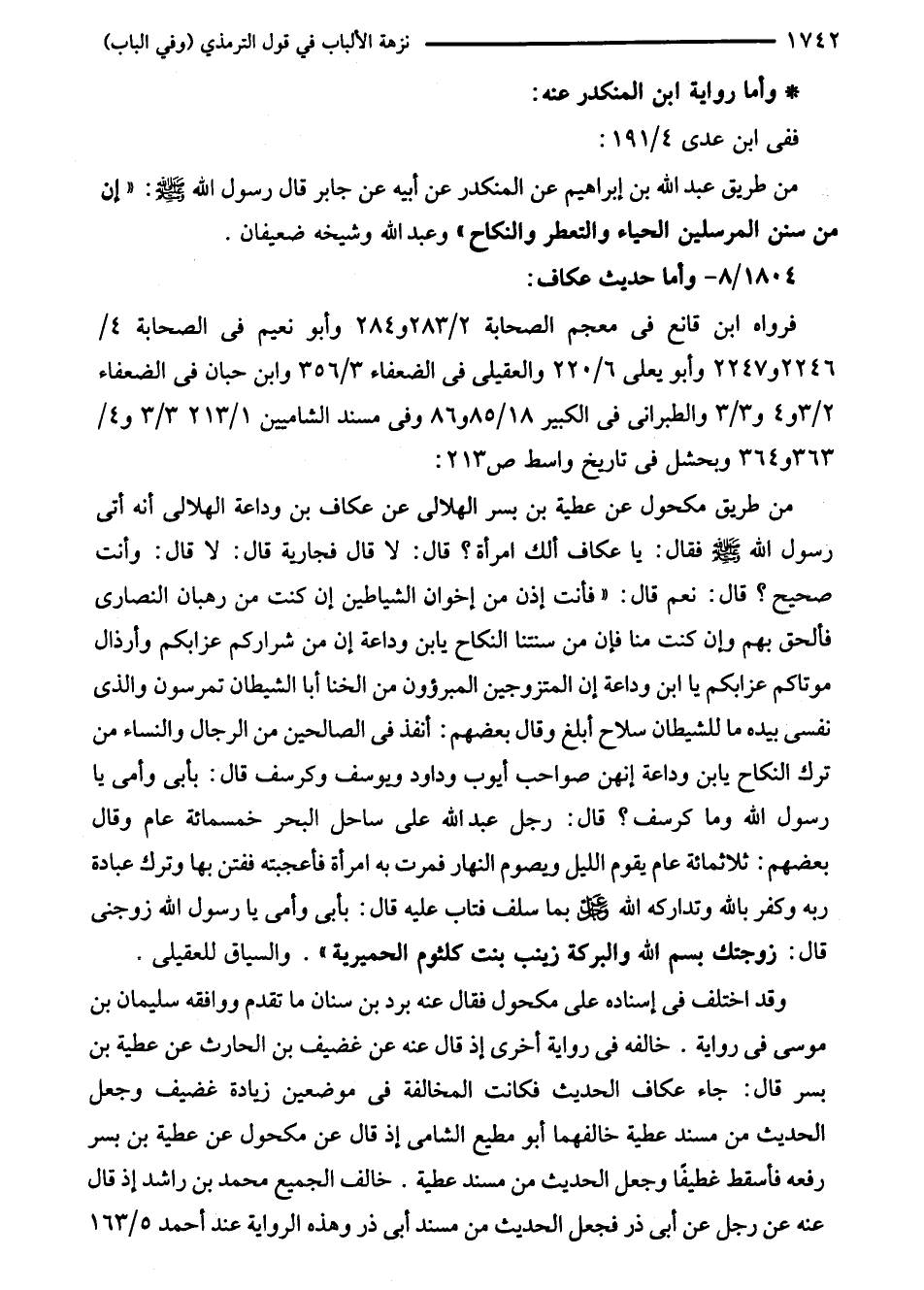 من طريق مكحول عن عطية بن بسر الهلالى عن عكاف بن وداعة الهلالى أنه أتى رسول الله - صلى الله عليه وسلم - فقال: يا عكاف ألك امرأة؟ قال: لا قال فجارية قال: لا قال: وأنت صحيح؟ قال: نعم قال: "فأنت إذن من إخوان الشياطين إن كنت من رهبان النصارى فالحق بهم وإن كنت منا فإن من سنتنا النكاح يابن وداعة إن من شراركم عزابكم وأرذال موتاكم عزابكم يا ابن وداعة إن المتزوجين المبرؤون من الخنا أبا الشيطان تمرسون والذى نفسى بيده ما للشيطان سلاح أبلغ وقال بعضهم: أنفذ في الصالحين من الرجال والنساء من ترك النكاح يابن وداعة إنهن صواحب أيوب وداود ويوسف وكرسف قال: بأبى وأمى يا رسول الله وما كرسف؟ قال: رجل عبد الله على ساحل البحر خمسمائة عام وقال بعضهم: ثلاثمائة عام يقوم الليل ويصوم النهار فمرت به امرأة فأعجبته ففتن بها وترك عبادة ربه وكفر بالله وتداركه الله -عز وجل- بما سلف فتاب عليه قال: بأبى وأمى يا رسول الله زوجنى قال: زوجتك بسم الله والبركة زينب بنت كلثوم الحميوية". والسياق للعقيلى.