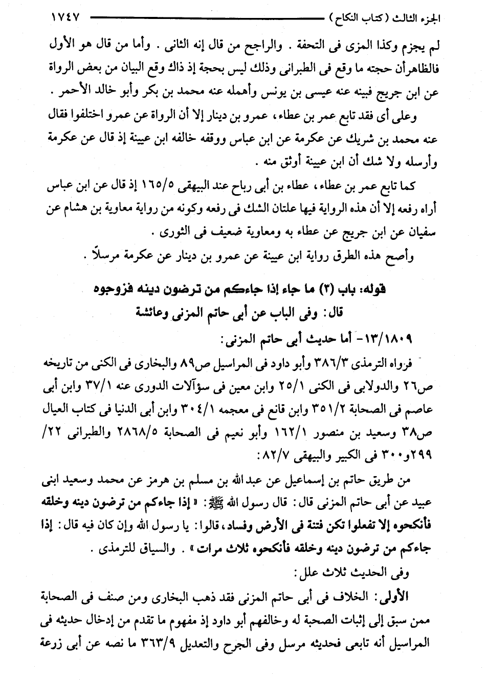من طريق حاتم بن إسماعيل عن عبد الله بن مسلم بن هرمز عن محمد وسعيد ابنى عبيد عن أبى حاتم المزنى قال: قال رسول الله - صلى الله عليه وسلم -: "إذا جاءكم من ترضون دينه وخلقه فأنكحوه إلا تفعلوا تكن فتنة في الأرض وفساد، قالوا. يا رسول الله وإن كان فيه قال: إذا جاءكم من ترضون دينه وخلقه فأنكحوه ثلاث مرات". والسياق للترمذي.
