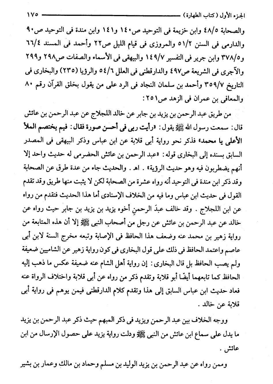 من طريق عبد الرحمن بن يزيد بن جابر عن خالد اللجلاج عن عبد الرحمن بن عائش قال: سمعت رسول الله - صلى الله عليه وسلم - يقول: "رأيت ربى في أحسن سورة فقال: فيم يختصم الملأ الأعلى يا محمد" فذكر نحو رواية أبى قلابة عن ابن عباس وذكر البيهقي في المصدر السابق بسنده إلى البخاري قوله: "عبد الرحمن بن عائش الحضرمى له حديث واحد إلا أنهم يضطربون فيه وهو حديث الرؤية". اهـ. والحديث جاء من عدة طرق عن الصحابة وقد ذكر ابن مندة في التوحيد أنه رواه عشرة من الصحابة لكن لا يثبت منها طريق وقد تقدم القول في حديث ابن عباس وما فيه من الخلاف الإسنادى أما هذا الحديث فتقدم من رواه عن ابن اللجلاج. وقد خالف عبد الرحمنِ أخوه يزيد بن يزيد بن جابر حيث رواه عن خالد عن عبد الرحمن بن عائش عن رجل من أصحاب النبي - صلى الله عليه وسلم - إلا أن هذه المتابعة من رواية زهير بن محمد عنه وضعف هذا الحافظ في الإصابة وتبعه مخرج السنة لابن أبى عاصم واعتمد الحافظ في ذلك على قول البخاري في كون رواية زهير عن الشاميين ضعيفة ولم يصب الحافظ بل قال البخاري: إن رواية أهل الشام عنه ضعيفة عكس ما ذهب إليه الحافظ كما تابعهما أيضًا أبو قلابة وتقدم ذكر من رواه عن أبى قلابة واختلاف الرواة عنه فعاد حديث ابن عباس السابق إلى هذا وتقدم كلام الدارقطني فيمن يوهم في رواية أبى قلابة عن خالد.