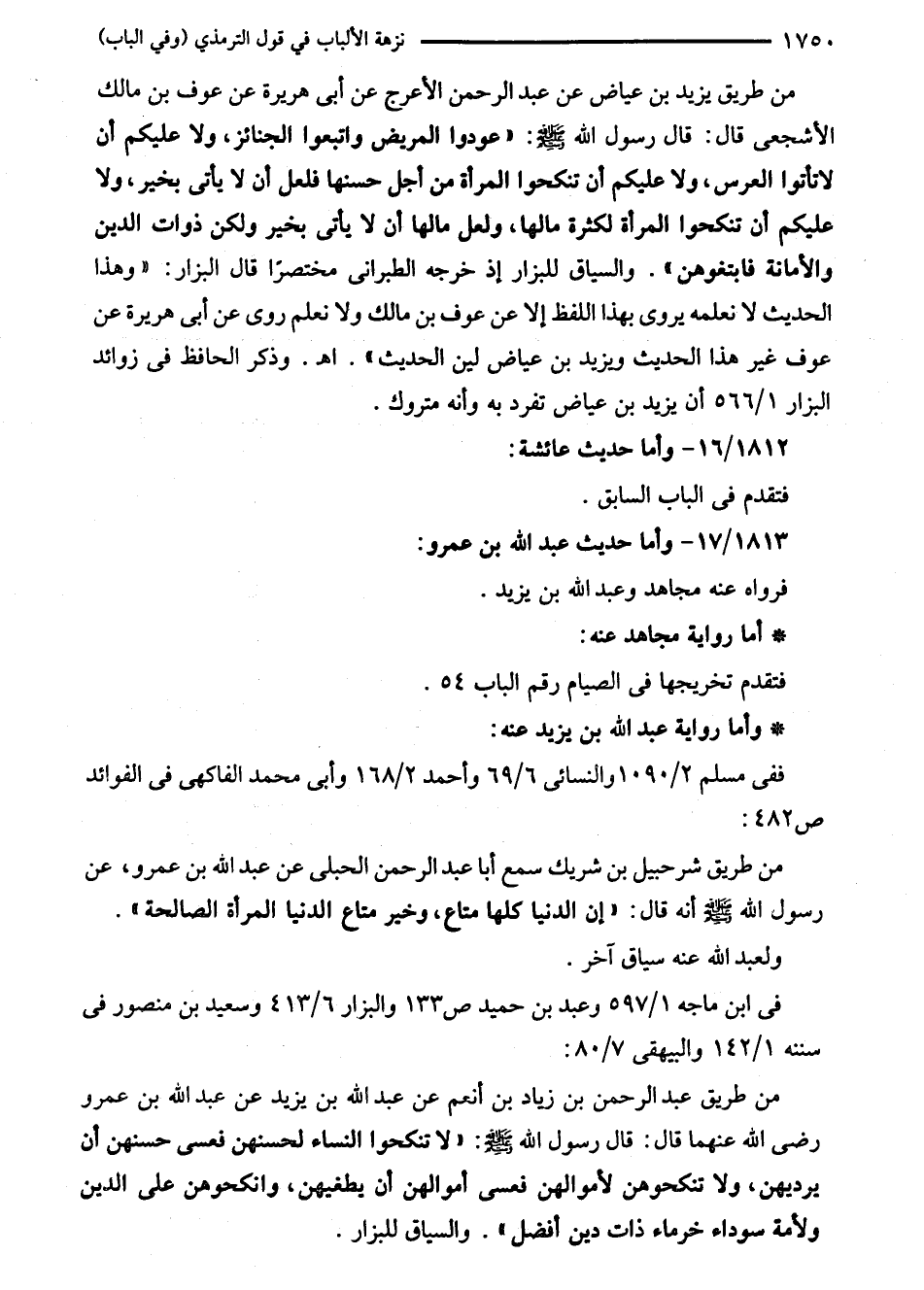 من طريق يزيد بن عياض عن عبد الرحمن الأعرج عن أبى هريرة عن عوف بن مالك الأشجعى قال: قال رسول الله - صلى الله عليه وسلم -: "عودوا المريض اتبعوا الجنائز، ولا عليكم أن لا تأتوا العرس، ولا عليكم أن تنكحوا المرأة من أجل حسنها فلعل أن لا يأتى بخير، ولا عليكم أن تنكحوا المرأة لكثرة مالها، ولعل مالها أن لا يأتى بخير ولكن ذوات الدين والأمانة فابتغوهن". والسياق للبزار إذ خرجه الطبراني مختصرًا قال البزار: "وهذا الحديث لا نعلمه يروى بهذا اللفظ إلا عن عوف بن مالك ولا نعلم روى عن أبى هريرة عن عوف غير هذا الحديث ويزيد بن عياض لين الحديث". اهـ. وذكر الحافظ في زوائد البزار 1/ 566 أن يزيد بن عياض تفرد به وأنه متروك.
