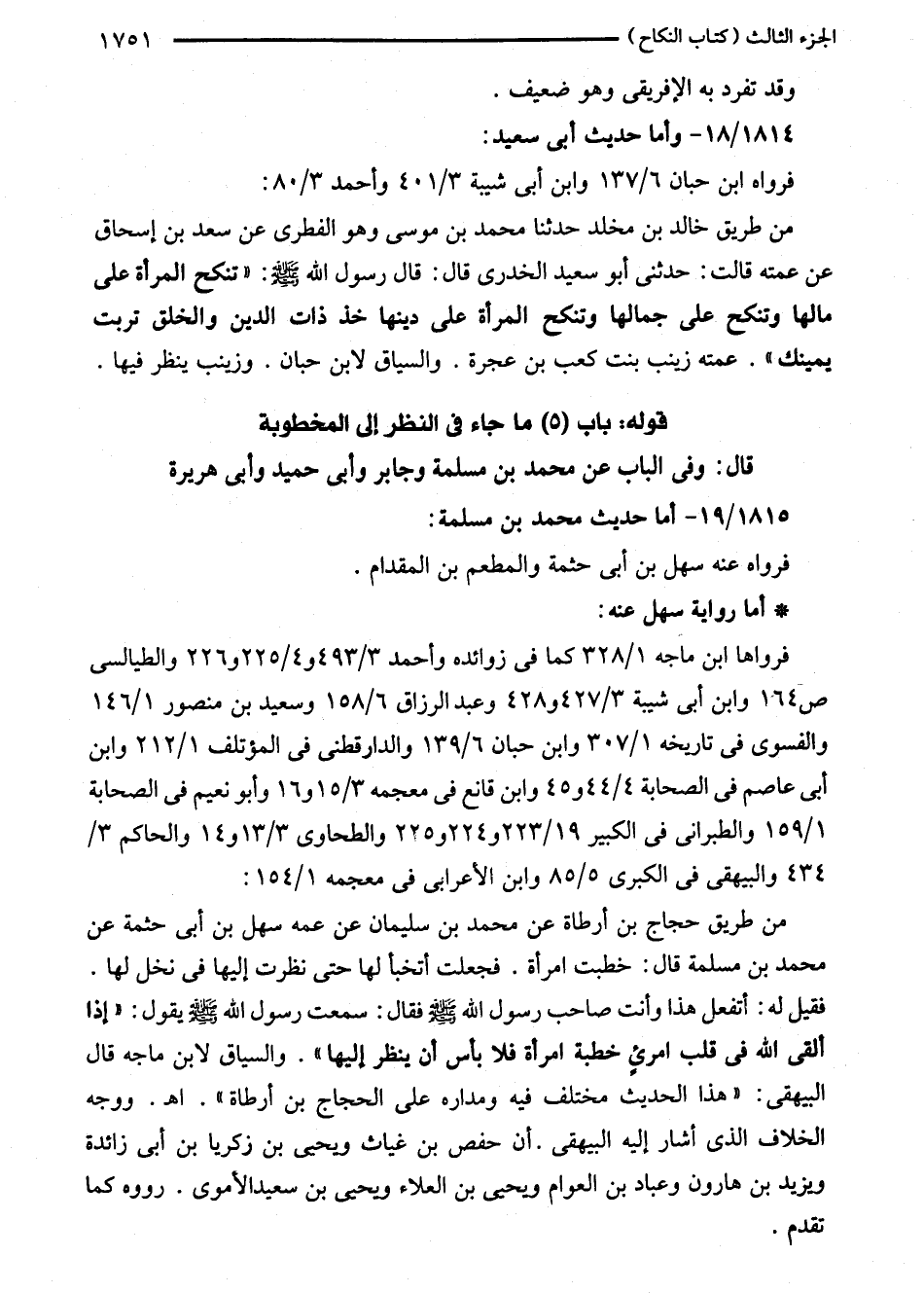 من طريق حجاج بن أرطاة عن محمد بن سليمان عن عمه سهل بن أبى حثمة عن محمد بن مسلمة قال: خطبت امرأة. فجعلت أتخبأ لها حتى نظرت إليها في نخل لها. فقيل له: أتفعل هذا وأنت صاحب رسول الله - صلى الله عليه وسلم - فقال: سمعت رسول الله - صلى الله عليه وسلم - يقول: "إذا ألقى الله في قلب امرئٍ خطبة امرأة فلا بأس أن ينظر إليها". والسياق لابن ماجه قال البيهقي: "هذا الحديث مختلف فيه ومداره على الحجاج بن أرطاة" اهـ. ووجه الخلاف الذى أشار إليه البيهقي. أن حفص بن غياث ويحيى بن زكريا بن أبى زائدة ويزيد بن هارون وعباد بن العوام ويحيى بن العلاء ويحيى بن سعيد الأموى. رووه كما تقدم.