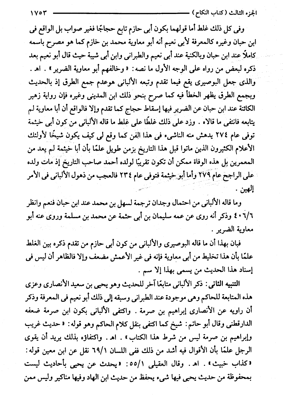 والذى جعل البوصيرى يقع فيما تقدم وتبعه الألبانى هو عدم جمع الطرق إذ بالحديث وبجمع الطرق يظهر الخطأ فيه كلما صرح بنحو ذلك ابن المدينى وغيره فإن رواية زهير الكائنة عند ابن حبان عن الضرير فيها إسقاط حجاج كلما تقدم والا فالواقع أن أبا معاوية لم يتابعه فانتفى ما قالاه. وزد على ذلك غلطًا على غلط ما قاله الألبانى من كون أبى خيثمة توفى عام 274 يدهش منه الناشىء في هذا الفن كلما وقع لى كيف يكون شيخًا لأولئك الأعلام الكثيرون الذين ماتوا قبل هذا التاريخ بزمن طويل علمًا بأن أبا خيثمة لم يعد من المعمرين بل هذه الوفاة ممكن أن تكون تقريبًا لولده أحمد صاحب التاريخ إذ مات ولده على الراجح عام 279 وإما أبو خيثمه فتوفى عام 234 فالعجب من ذهول الألبانى في الأمر الهين: