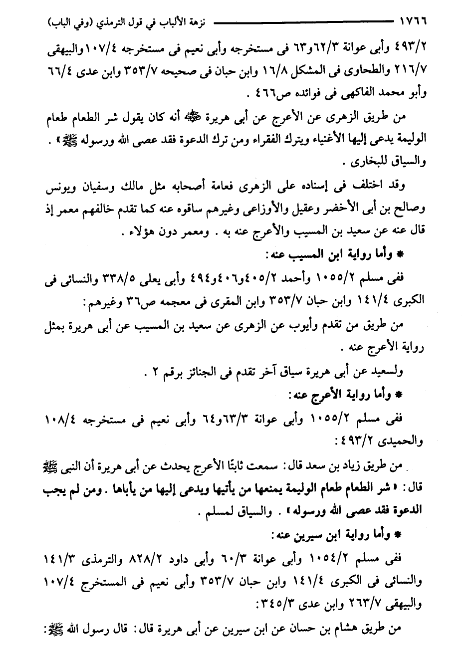 من طريق الزهرى عن الأعرج عن أبي هريرة - رضي الله عنه - أنه كان يقول شر الطعام طعام الوليمة يدعى إليها الأغنياء ويترك الفقراء ومن ترك الدعوة فقد عصى الله ورسوله - صلى الله عليه وسلم - ". والسياق للبخاري.