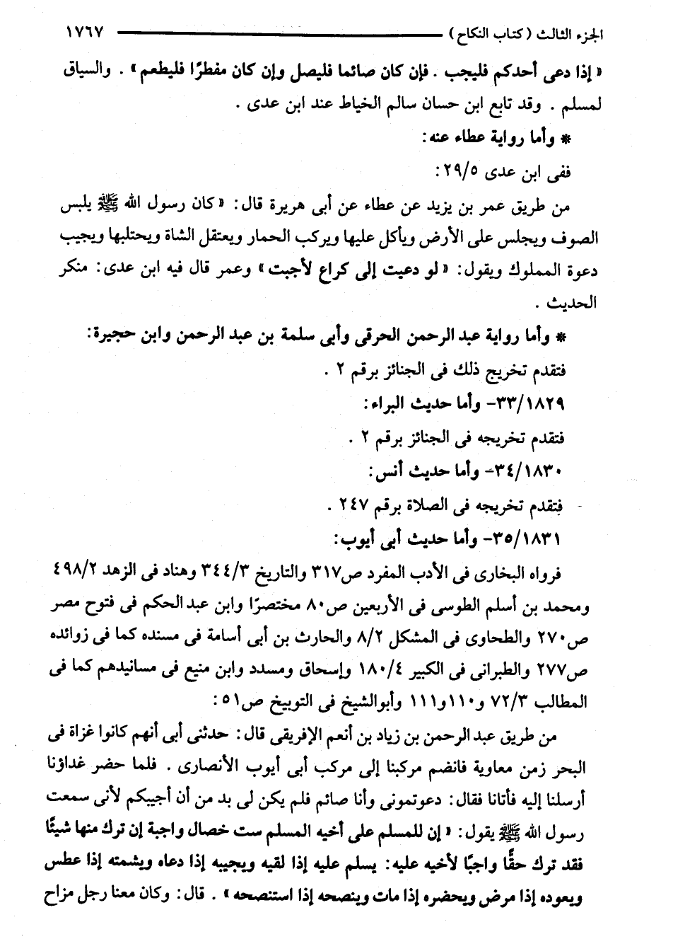 "إذا دعى أحدكم فليجب. فإن كان صائما فليصل وإن كان مفطرًا فليطعم". والسياق لمسلم. وقد تابع ابن حسان سالم الخياط عند ابن عدى.