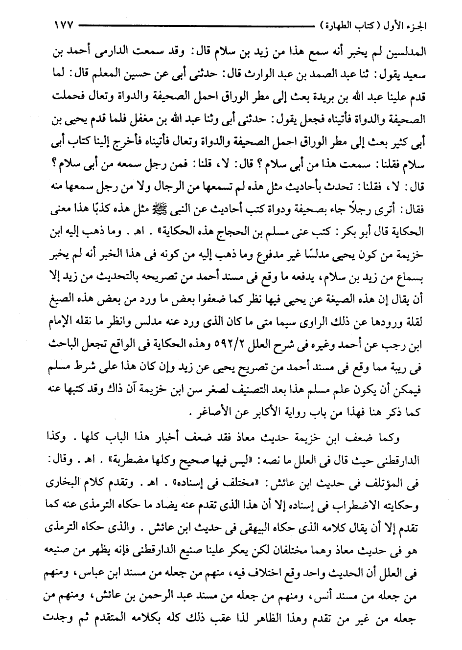 المدلسين لم يخبر أنه سمع هذا من زيد بن سلام قال: وقد سمعت الدارمي أحمد بن سعيد يقول: ثنا عبد الصمد بن عبد الوارث قال: حدثنى أبى عن حسين المعلم قال: لما قدم علينا عبد الله بن بريدة بعث إلى مطر الوراق احمل الصحيفة والدواة وتعال فحملت الصحيفة والدواة فأتيناه فجعل يقول: حدثنى أبى وثنا عبد الله بن مغفل فلما قدم يحيى بن أبى كثير بعث إلى مطر الوراق احمل الصحيفة والدواة وتعال فأتيناه فأخرج إلينا كتاب أبى سلام فقلنا: سمعت هذا من أبى سلام؟ قال: لا، قلنا: فمن رجل سمعه من أبى سلام؟ قال: لا، فقلنا: تحدث بأحاديث مثل هذه لم تسمعها من الرجال ولا من رجل سمعها منه فقال: أترى رجلًا جاء بصحيفة ودواة كتب أحاديث عن النبي - صلى الله عليه وسلم - مثل هذه كذبًا هذا معنى الحكاية قال أبو بكر: كتب عنى مسلم بن الحجاج هذه الحكاية". اهـ. وما ذهب إليه ابن خزيمة من كون يحيى مدلسًا غير مدفوع وما ذهب إليه من كونه في هذا الخبر أنه لم يخبر بسماع من زيد بن سلام، يدفعه ما وقع في مسند أحمد من تصريحه بالتحديث من زيد إلا أن يقال إن هذه الصيغة عن يحيى فيها نظر كما ضعفوا بعض ما ورد من بعض هذه الصيغ لقلة ورودها عن ذلك الراوى سيما متى ما كان الذى ورد عنه مدلس وانظر ما نقله الإمام ابن رجب عن أحمد وغيره في شرح العلل 2/ 592 وهذه الحكاية في الواقع تجعل الباحث في ريبة مما وقع في مسند أحمد من تصريح يحيى عن زيد وإن كان هذا على شرط مسلم فيمكن أن يكون علم مسلم هذا بعد التصنيف لصغر سن ابن خزيمة آن ذاك وقد كتبها عنه كما ذكر هنا فهذا من باب رواية الأكابر عن الأصاغر.