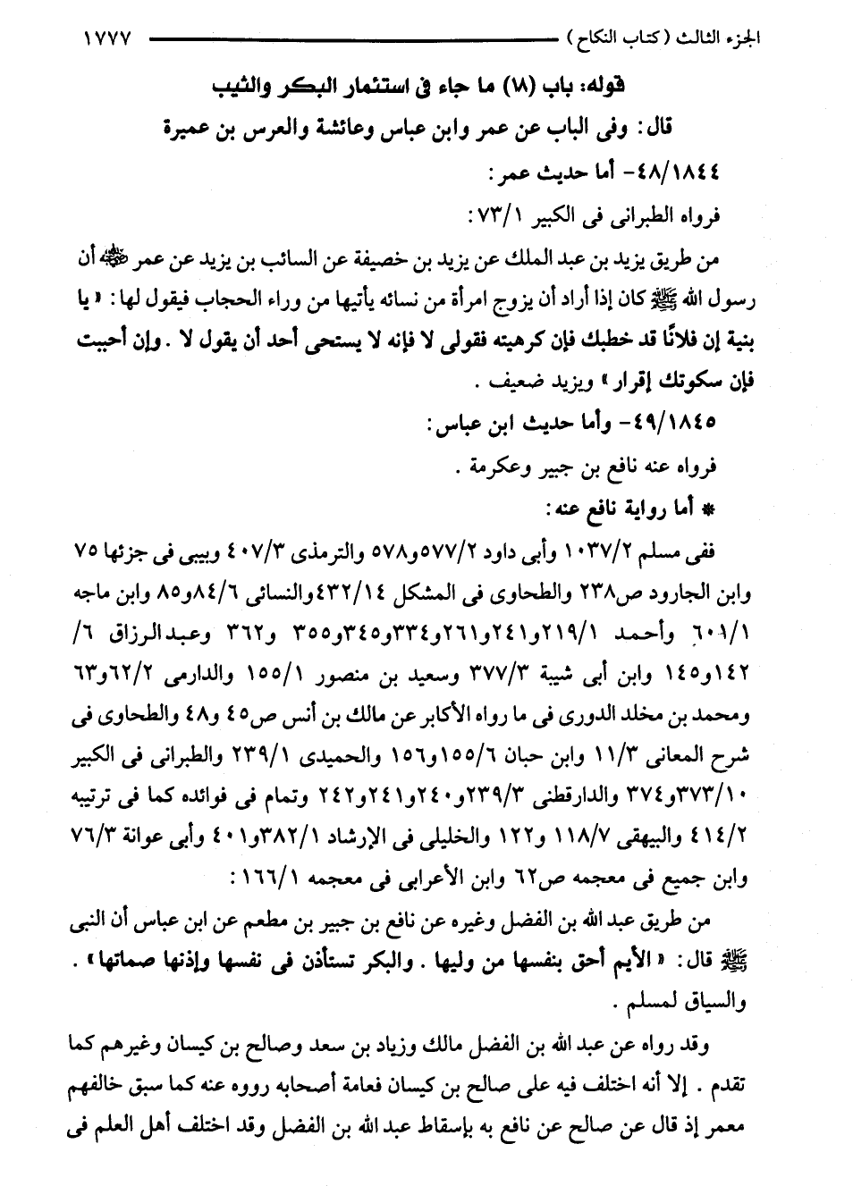 من طريق يزيد بن عبد الملك عن يزيد بن خصيفة عن السائب بن يزيد عن عمر - رضي الله عنه - أن رسول الله - صلى الله عليه وسلم - كان إذا أراد أن يزوج امرأة من نسائه يأتيها من وراء الحجاب فيقول لها: "يا بنية أن فلانًا قد خطبك فإن كرهيته فقولى لا فإنه لا يستحى أحد أن يقول لا. وإن أحببت فإن سكوتك إقرار" ويزيد ضعيف.