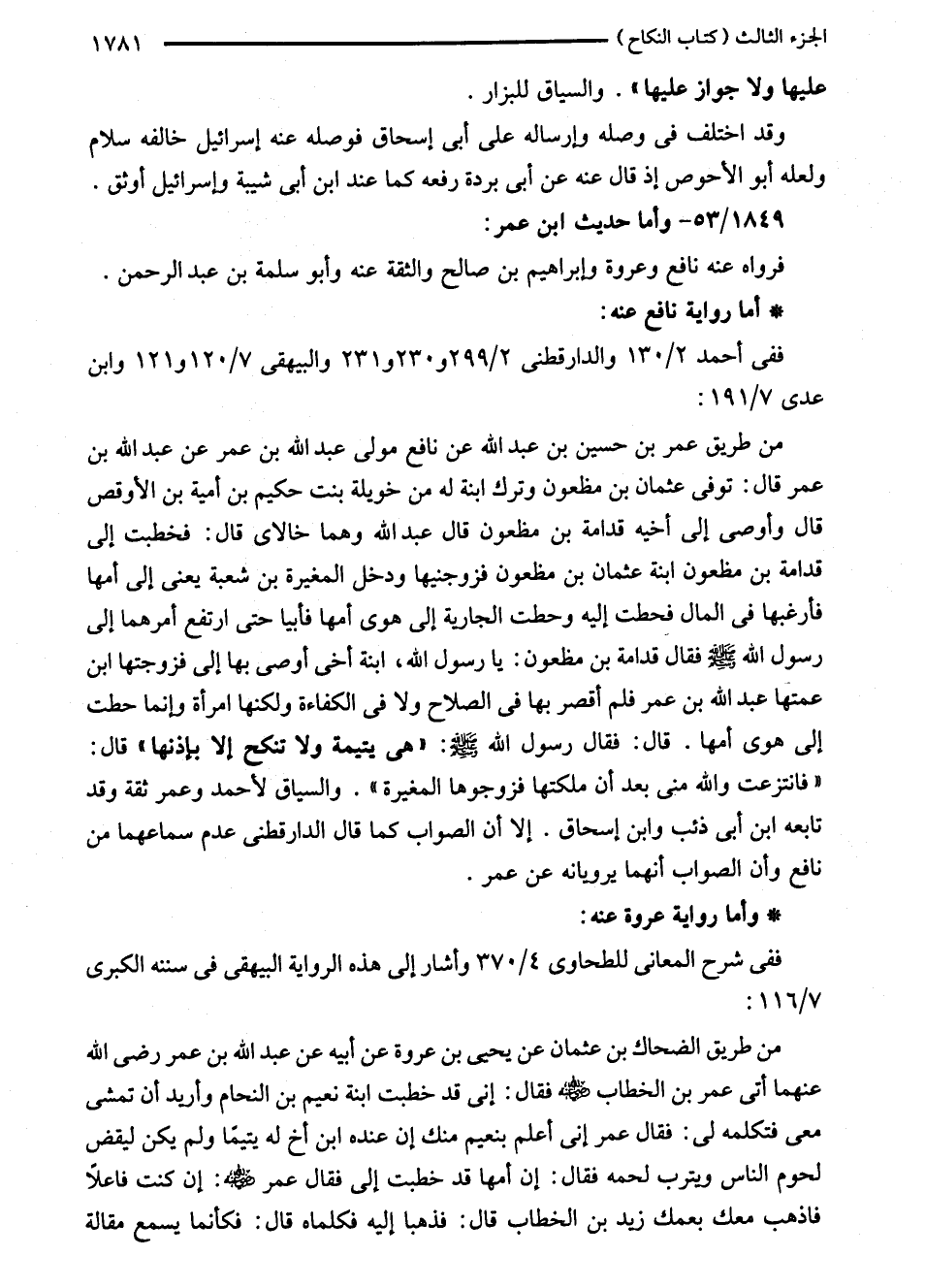 من طريق عمر بن حسين بن عبد الله عن نافع مولى عبد الله بن عمر عن عبد الله بن عمر قال: توفى عثمان بن مظعون وترك ابنة له من خويلة بنت حكيم بن أمية بن الأوقص قال وأوصى إلى أخيه قدامة بن مظعون قال عبد الله وهما خالاى قال: فخطبت إلى قدامة بن مظعون ابنة عثمان بن مظعون فزوجنيها ودخل المغيرة بن شعبة يعني إلى أمها فأرغبها في المال فحطت إليه وحطت الجارية إلى هوى أمها فأبيا حتى ارتفع أمرهما إلى رسول الله - صلى الله عليه وسلم - فقال قدامة بن مظعون: يا رسول الله، ابنة أخى أوصى بها إلى فزوجتها ابن عمتها عبد الله بن عمر فلم أقصر بها في الصلاح ولا في الكفاءة ولكنها امرأة وإنما حطت إلى هوى أمها. قال: فقال رسول الله - صلى الله عليه وسلم -: "هي يتيمة ولا تنكح إلا بإذنها" قال: "فانتزعت والله منى بعد أن ملكتها فزوجوها المغيرة". والسياق لأحمد وعمر ثقة وقد تابعه ابن أبي ذئب وابن إسحاق. إلا أن الصواب كما قال الدارقطني عدم سماعهما من نافع وأن الصواب أنهما يرويانه عن عمر.