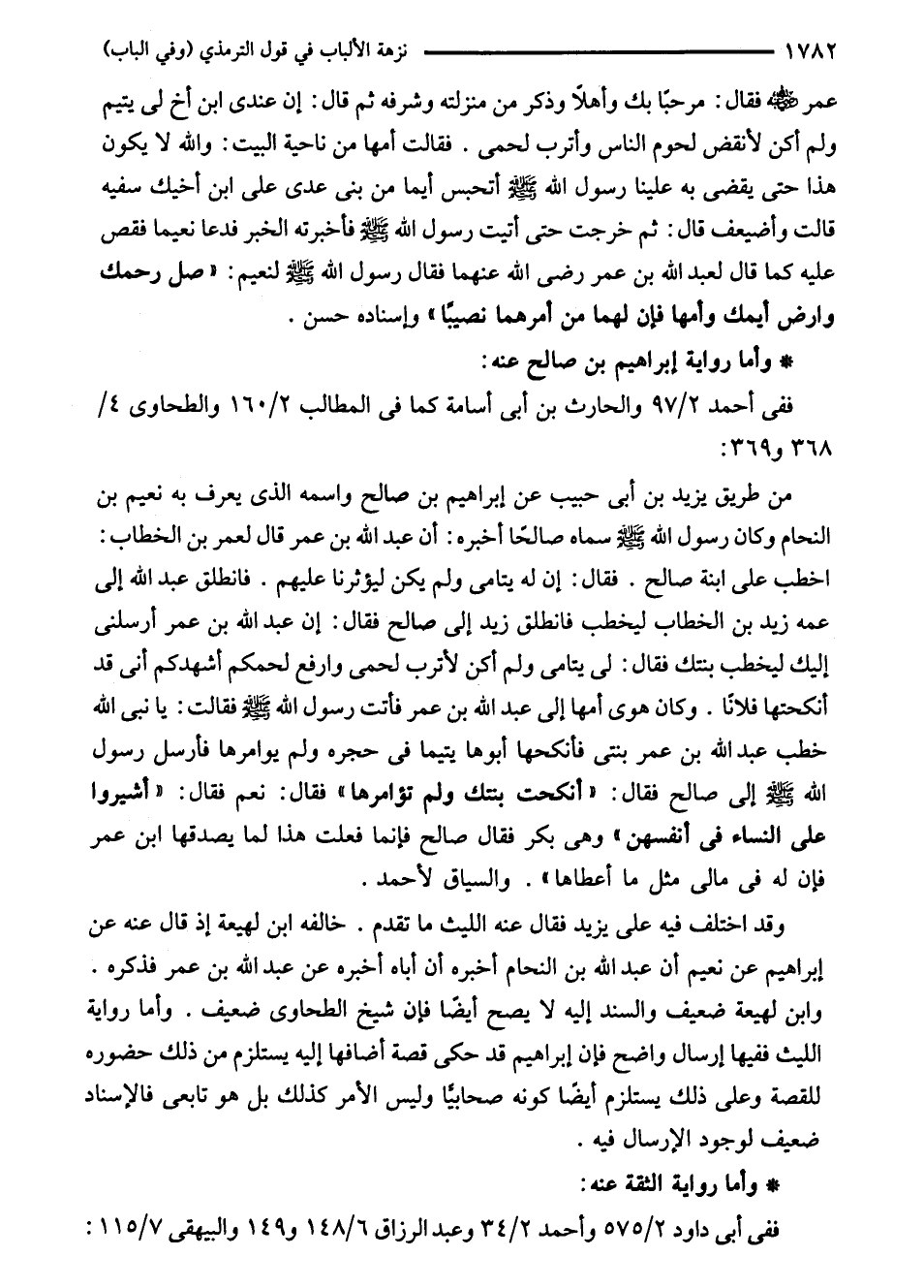 من طريق يزيد بن أبي حبيب عن إبراهيم بن صالح واسمه الذي يعرف به نعيم بن النحام وكان رسول الله - صلى الله عليه وسلم - سماه صالحًا أخبره: أن عبد الله بن عمر قال لعمر بن الخطاب: اخطب على ابنة صالح. فقال: إن له يتامى ولم يكن ليؤثرنا عليهم. فانطلق عبد الله إلى عمه زيد بن الخطاب ليخطب فانطلق زيد إلى صالح فقال: إن عبد الله بن عمر أرسلنى إليك ليخطب بنتك فقال: لى يتامى ولم أكن لأترب لحمى وارفع لحمكم أشهدكم أنى قد أنكحتها فلاناً. وكان هوى أمها إلى عبد الله بن عمر فأتت رسول الله - صلى الله عليه وسلم - فقالت: يا نبى الله خطب عبد الله بن عمر بنتى فأنكحها أبوها يتيماً في حجره ولم يوامرها فأرسل رسول الله - صلى الله عليه وسلم - إلى صالح فقال: "أنكحت بنتك ولم تؤامرها" فقال: نعم فقال: "أشيروا على النساء في أنفسهن" وهى بكر فقال صالح فإنما فعلت هذا لما يصدقها ابن عمر فإن له في مال مثل ما أعطاها". والسياق لأحمد.