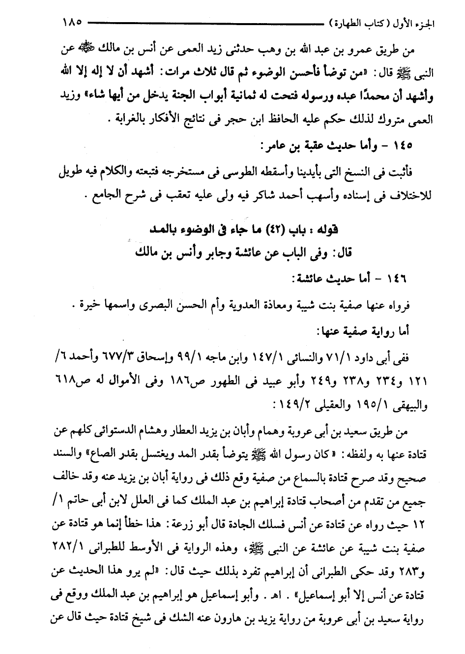 من طريق سعيد بن أبى عروبة وهمام وأبان بن يزيد العطار وهشام الدستوائى كلهم عن قتادة عنها به ولفظه: "كان رسول الله - صلى الله عليه وسلم - يتوضأ بقدر المد ويغتسل بقدر الصاع" والسند صحيح وقد صرح قتادة بالسماع من صفية وقع ذلك في رواية أبان بن يريد عنه وقد خالف جميع من تقدم من أصحاب قتادة إبراهيم بن عبد الملك كما في العلل لابن أبى حاتم 1/ 12 حيث رواه عن قتادة عن أنس فسلك الجادة قال أبو زرعة: هذا خطا إنما هو قتادة عن صفية بنت شيبة عن عائشة عن النبي - صلى الله عليه وسلم -، وهذه الرواية في الأوسط للطبراني 1/ 282 و 283 وقد حكى الطبراني أن إبراهيم تفرد بذلك حيث قال: "لم يرو هذا الحديث عن قتادة عن أنس إلا أبو إسماعيل". اهـ. وأبو إسماعيل هو إبراهيم بن عبد الملك ووقع في رواية سعيد بن أبى عروبة من رواية يزيد بن هارون عنه الشك في شيخ قتادة حيث قال عن