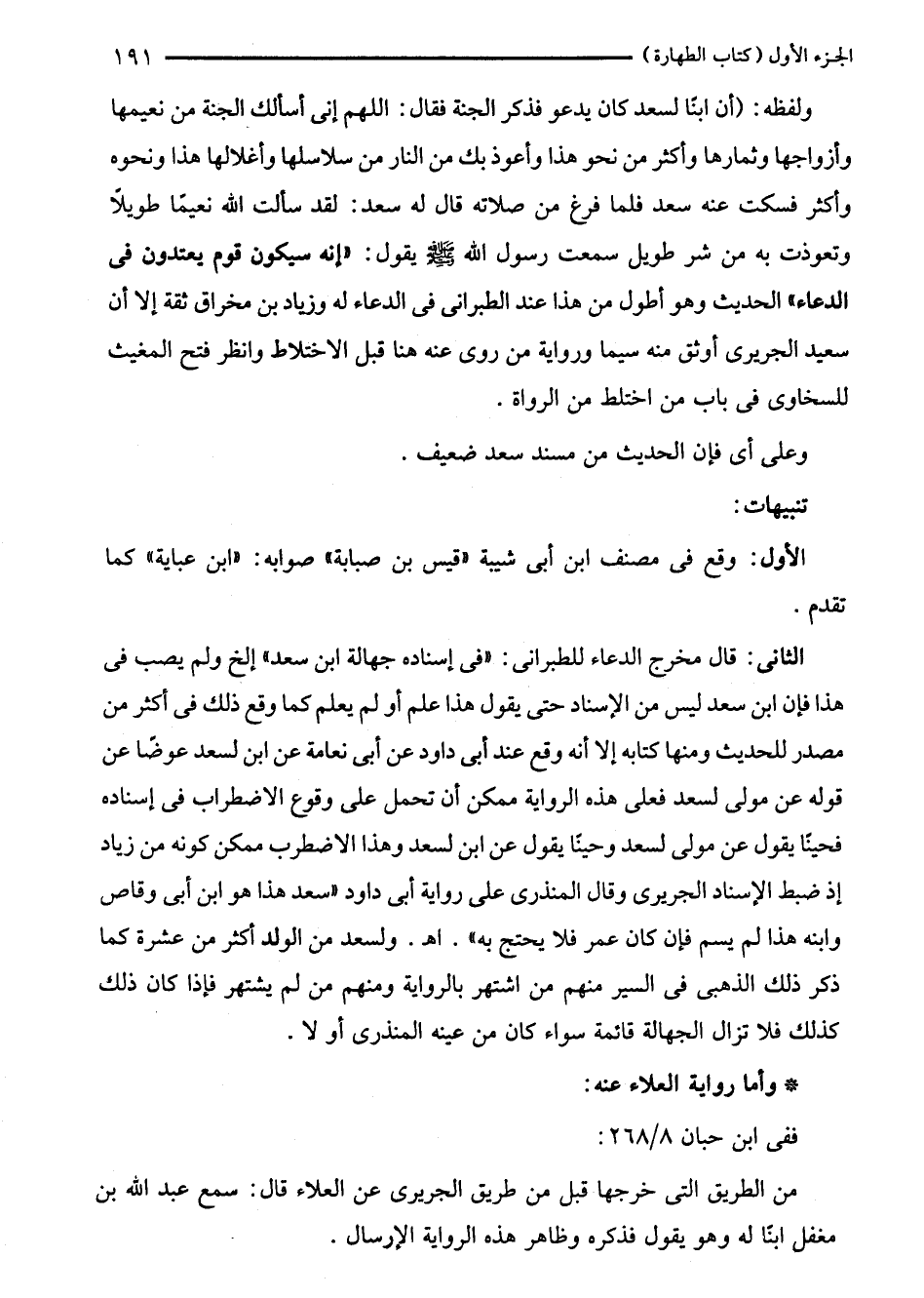 الثانى: قال مخرج الدعاء للطبراني: "في إسناده جهالة ابن سعد" إلخ ولم يصب في هذا فإن ابن سعد ليس من الإسناد حتى يقول هذا علم أو لم يعلم كما وقع ذلك في أكثر من مصدر للحديث ومنها كتابه إلا أنه وقع عند أبى داود عن أبى نعامة عن ابن لسعد عوضًا عن قوله عن مولى لسعد فعلى هذه الرواية ممكن أن تحمل على وقوع الاضطراب في إسناده فحينًا يقول عن مولى لسعد وحينًا يقول عن ابن لسعد وهذا الاضطرب ممكن كونه من زياد إذ ضبط الإسناد الجريرى وقال المنذرى على رواية أبى داود "سعد هذا هو ابن أبى وقاص وابنه هذا لم يسم فإن كان عمر فلا يحتج به". اهـ. ولسعد من الولد أكثر من عشرة كما ذكر ذلك الذهبى في السير منهم من اشتهر بالرواية ومنهم من لم يشتهر فإذا كان ذلك كذلك فلا تزال الجهالة قائمة سواء كان من عينه المنذرى أو لا.