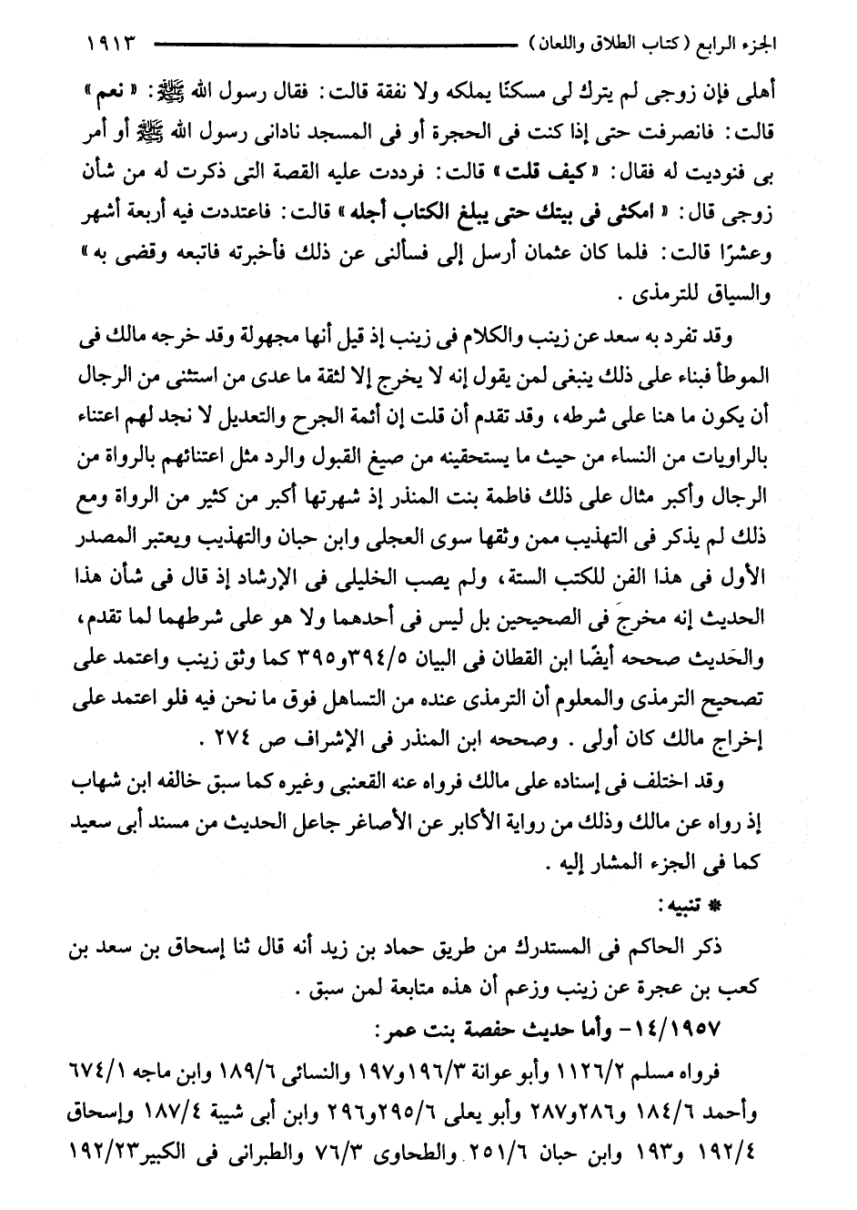 وقد تفرد به سعد عن زينب والكلام في زينب إذ قيل أنها مجهولة وقد خرجه مالك في الموطأ فبناء على ذلك ينبغى لمن يقول إنه لا يخرج إلا لثقة ما عدى من استثنى من الرجال أن يكون ما هنا على شرطه، وقد تقدم أن قلت إن أئمة الجرح والتعديل لا نجد لهم اعتناء بالراويات من النساء من حيث ما يستحقينه من صيغ القبول والرد مثل اعتنائهم بالرواة من الرجال وأكبر مثال على ذلك فاطمة بنت المنذر إذ شهرتها أكبر من كثير من الرواة ومع ذلك لم يذكر في التهذيب ممن وثقها سوى العجلى وابن حبان والتهذيب ويعتبر المصدر الأول في هذا الفن للكتب الستة، ولم يصب الخليلى في الإرشاد إذ قال في شأن هذا الحديث إنه مخرج في الصحيحين بل ليس في أحدهما ولا هو على شرطهما لما تقدم، والحديث صححه أيضًا ابن القطان في البيان 5/ 394 و 395 كما وثق زينب واعتمد على تصحيح الترمذي والمعلوم أن الترمذي عنده من التساهل فوق ما نحن فيه فلو اعتمد على إخراج مالك كان أولى. وصححه ابن المنذر في الإشراف ص 274.