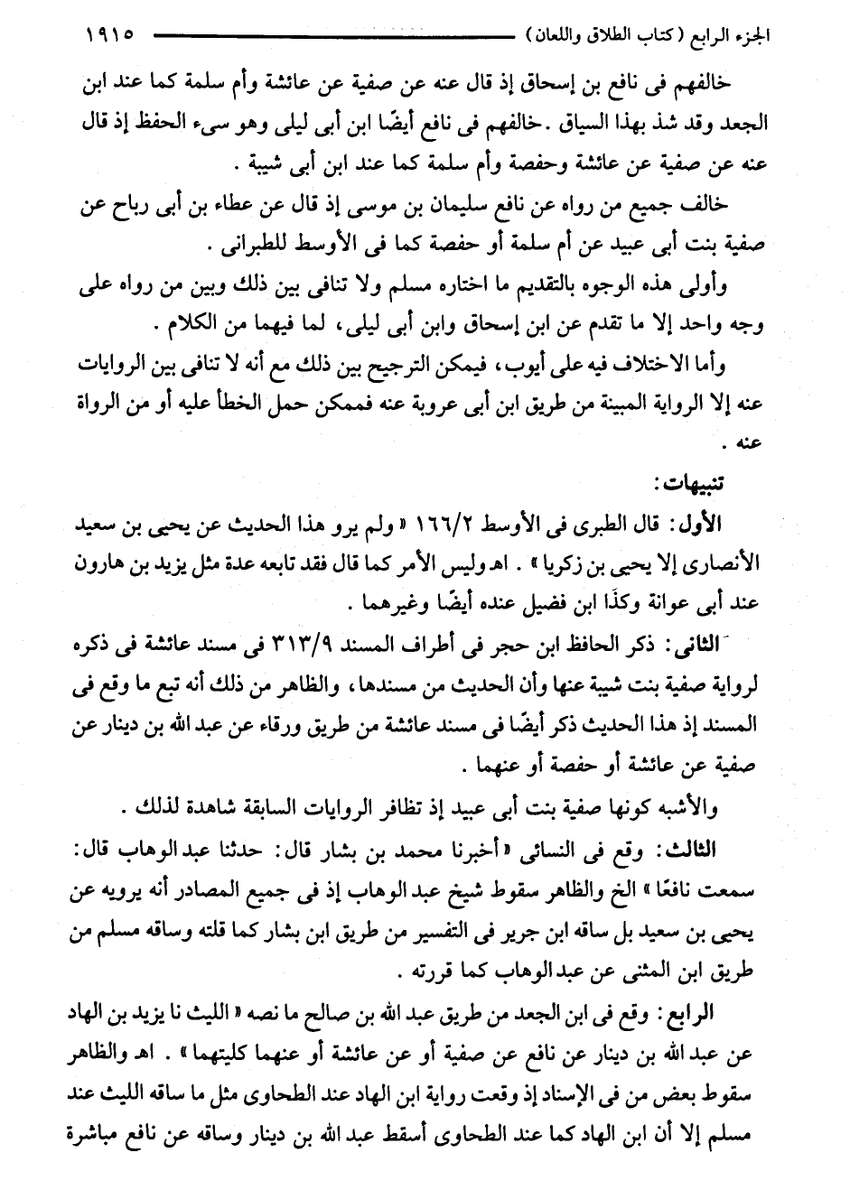 الرابع: وقع في ابن الجعد من طريق عبد الله بن صالح ما نصه "الليث نا يزيد بن الهاد عن عبد الله بن دينار عن نافع عن صفية أو عن عائشة أو عنهما كليتهما". اهـ والظاهر سقوط بعض من في الإسناد إذ وقعت رواية ابن الهاد عند الطحاوي مثل ما ساقه الليث عند مسلم إلا أن ابن الهاد كلما عند الطحاوي أسقط عبد الله بن دينار وساقه عن نافع مباشرة