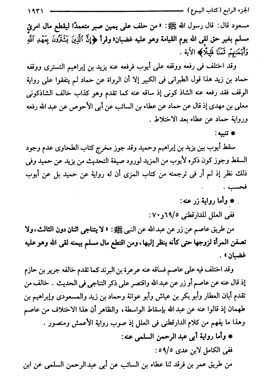 مسعود قال: قال رسول الله - صلى الله عليه وسلم -: "من حلف على يمين صبر متعمدًا ليقطع مال امرئٍ مسلم بغير حق لقى الله يوم القيامة وهو عليه غضبان" وقرأ {إِنَّ الَّذِينَ يَشْتَرُونَ بِعَهْدِ اللَّهِ وَأَيْمَانِهِمْ ثَمَنًا قَلِيلًا} الآية.