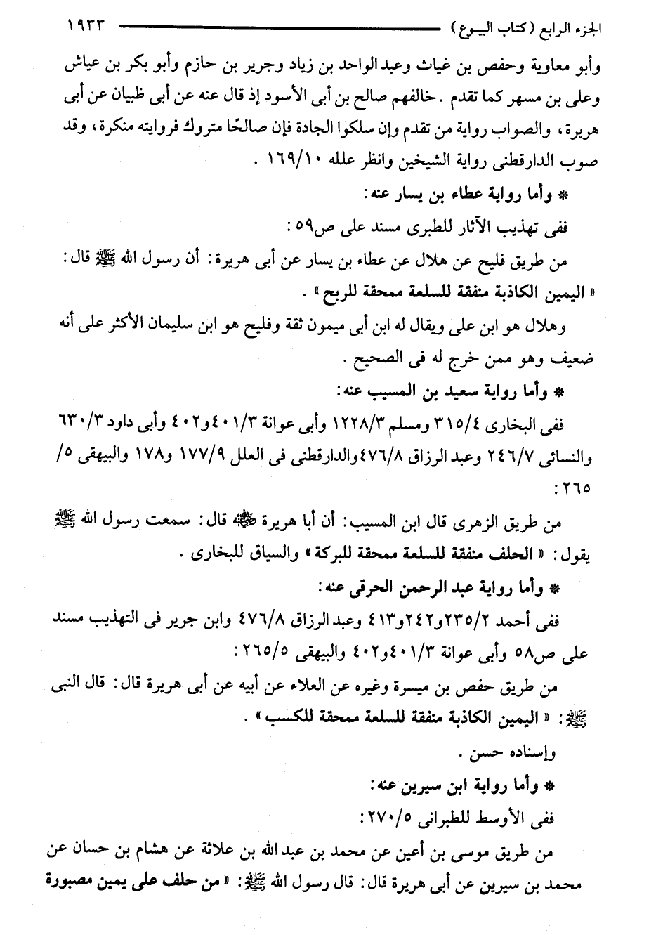 من طريق فليح عن هلال عن عطاء بن يسار عن أبي هريرة: أن رسول الله - صلى الله عليه وسلم - قال: "اليمين الكاذبة منفقة للسلعة ممحقة للربح".