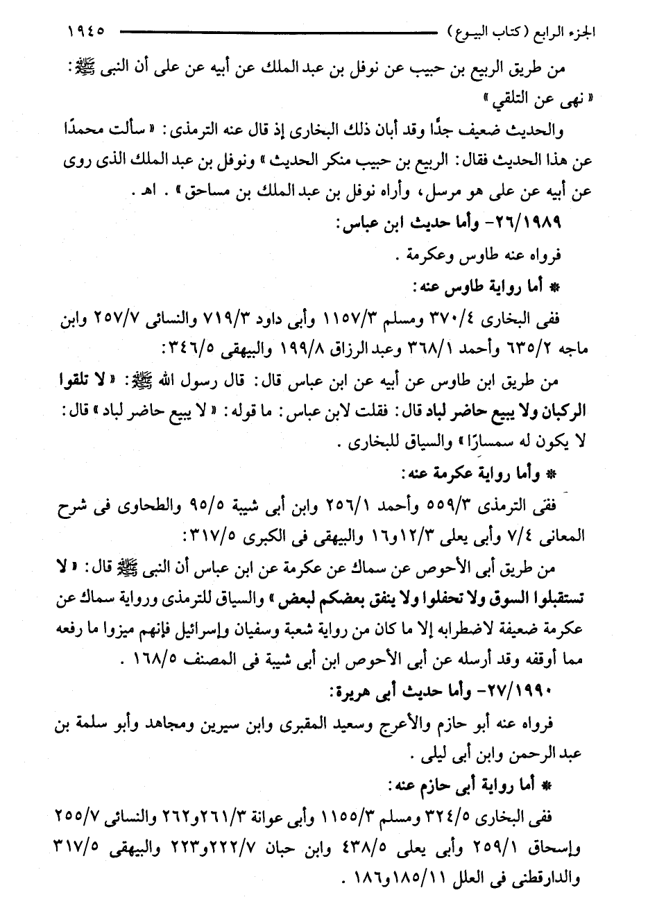 من طريق أبى الأحوص عن سماك عن عكرمة عن ابن عباس أن النبي - صلى الله عليه وسلم - قال: "لا تستقبلوا السوق ولا تحفلوا ولا ينفق بعضكم لبعض" والسياق للترمذي ورواية سماك عن عكرمة ضعيفة لاضطرابه إلا ما كان من رواية شعبة وسفيان وإسرائيل فإنهم ميزوا ما رفعه مما أوقفه وقد أرسله عن أبي الأحوص ابن أبي شيبة في المصنف 5/ 168.