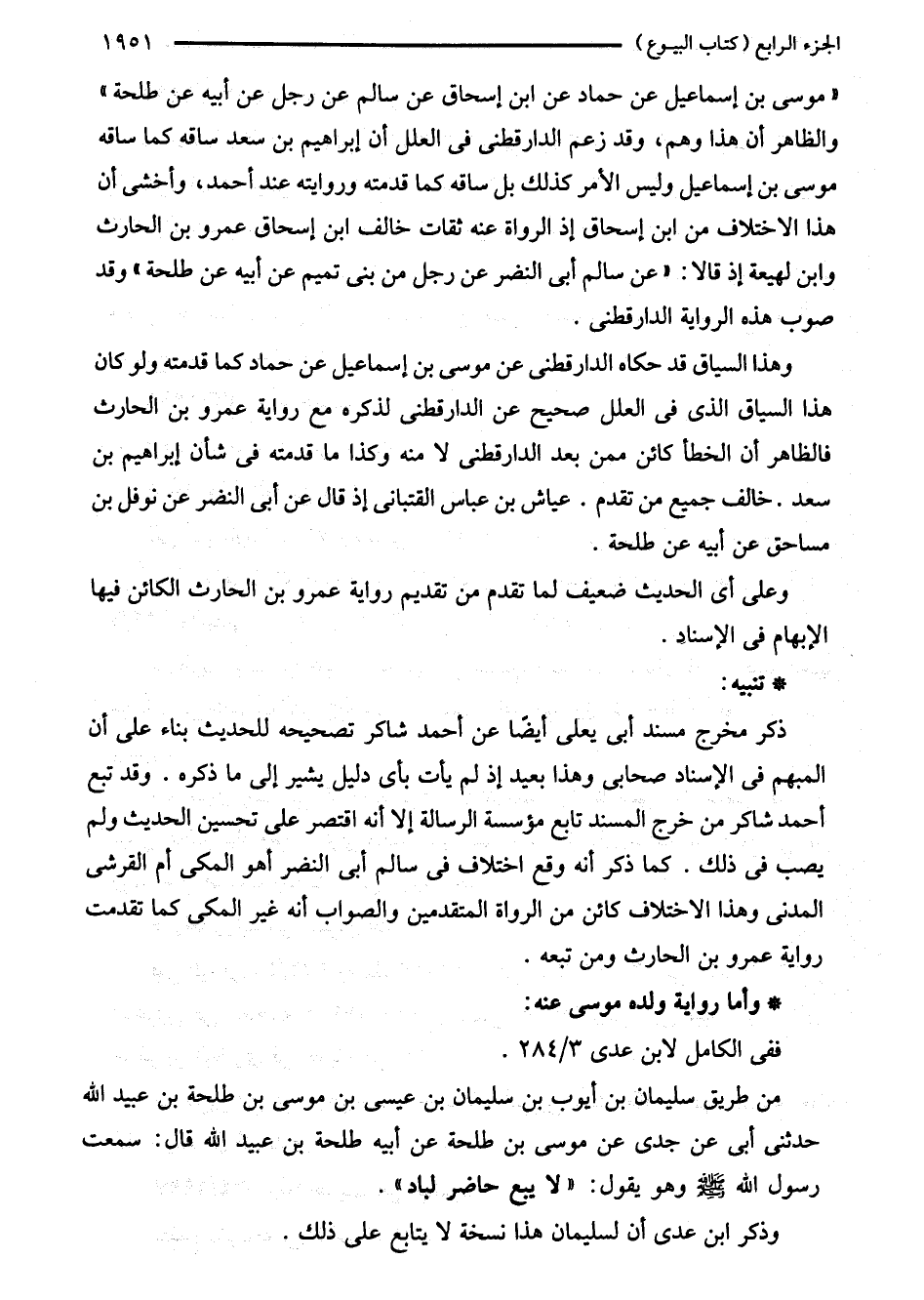 "موسى بن إسماعيل عن حماد عن ابن إسحاق عن سالم عن رجل عن أبيه عن طلحة" والظاهر أن هذا وهم، وقد زعم الدارقطني في العلل أن إبراهيم بن سعد ساقه كما ساقه موسى بن إسماعيل وليس الأمر كذلك بل ساقه كما قدمته وروايته عند أحمد، وأخشى أن هذا الاختلاف من ابن إسحاق إذ الرواة عنه ثقات خالف ابن إسحاق عمرو بن الحارث وابن لهيعة إذ قالا: "عن سالم أبى النضر عن رجل من بني تميم عن أبيه عن طلحة" وقد صوب هذه الرواية الدارقطني.