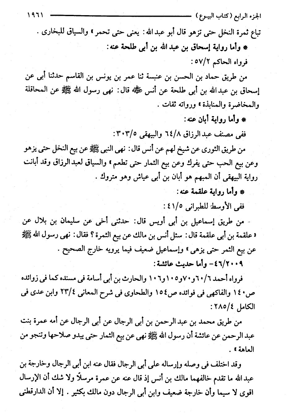 من طريق محمد بن عبد الرحمن بن أبي الرجال عن أبي الرجال عن أمه عمرة بنت عبد الرحمن عن عائشة أن رسول الله - صلى الله عليه وسلم - نهى عن بيع الثمار حتى يبدو صلاحها وتنجو من العاهة".