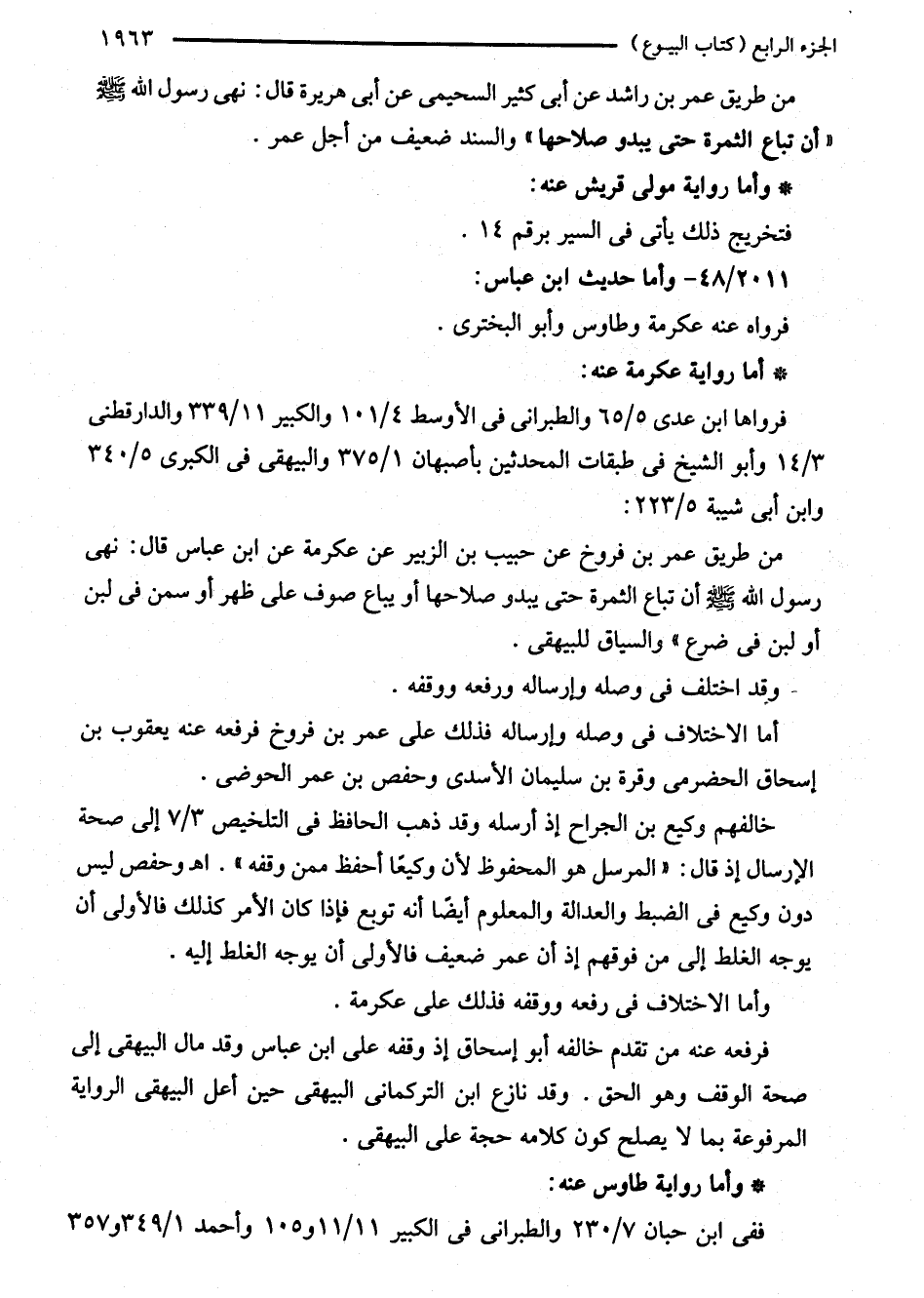 من طريق عمر بن راشد عن أبي كثير السحيمى عن أبي هريرة قال: نهى رسول الله - صلى الله عليه وسلم - "أن تباع الثمرة حتى يبدو صلاحها" والسند ضعيف من أجل عمر.