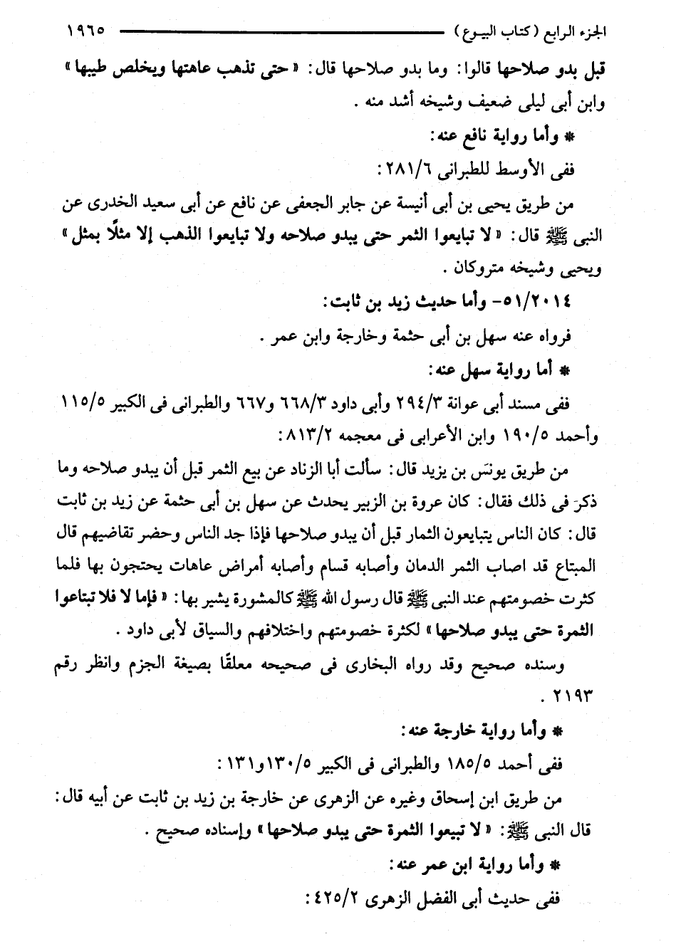 من طريق ابن إسحاق وغيره عن الزهرى عن خارجة بن زيد بن ثابت عن أبيه قال: قال النبي - صلى الله عليه وسلم -: "لا تبيعوا الثمرة حتى يبدو لاحها" وإسناده صحيح.