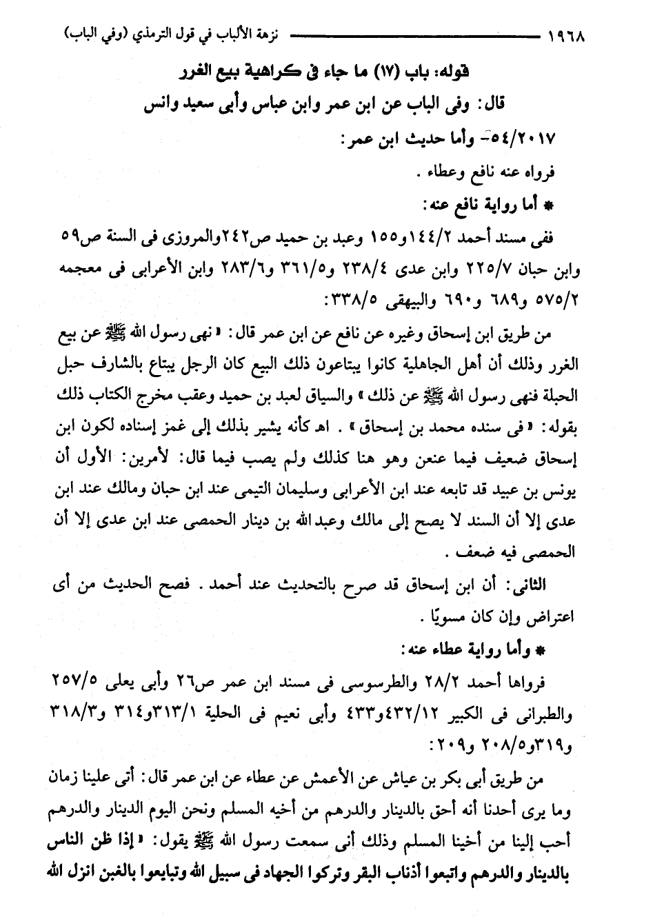من طريق ابن إسحاق وغيره عن نافع عن ابن عمر قال: "نهى رسول الله - صلى الله عليه وسلم - عن بيع الغرر وذلك أن أهل الجاهلية كانوا يبتاعون ذلك البيع كان الرجل يبتاع بالشارف حبل الحبلة فنهى رسول الله - صلى الله عليه وسلم - عن ذلك" والسياق لعبد بن حميد وعقب مخرج الكتاب ذلك بقوله: "في سنده محمد بن إسحاق". اهـ كأنه يشير بذلك إلى غمز إسناده لكون ابن إسحاق ضعيف فيما عنعن وهو هنا كذلك ولم يصب فيما قال: لأمرين: الأول أن يونس بن عبيد قد تابعه عند ابن الأعرابى وسليمان التيمي عند ابن حبان ومالك عند ابن على إلا أن السند لا يصح إلى مالك وعبد الله بن دينار الحمصى عند ابن عدي إلا أن الحمصى فيه ضعف.