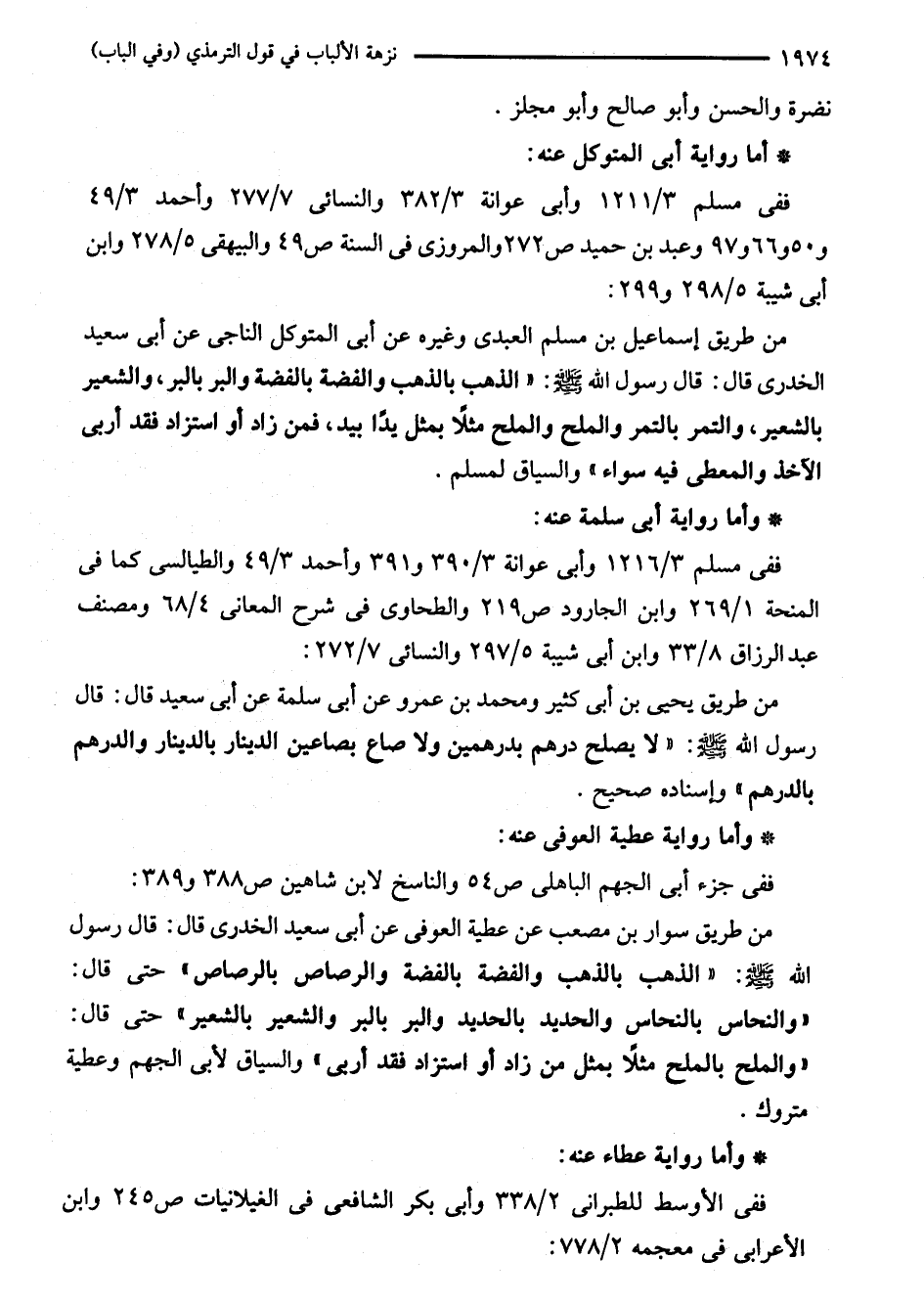 من طريق يحيى بن أبى كثير ومحمد بن عمرو عن أبى سلمة عن أبى سعيد قال: قال رسول الله - صلى الله عليه وسلم -: "لا يصلح درهم بدرهمين ولا صاع بصاعين الدينار بالدينار والدرهم بالدرهم " وإسناده صحيح.