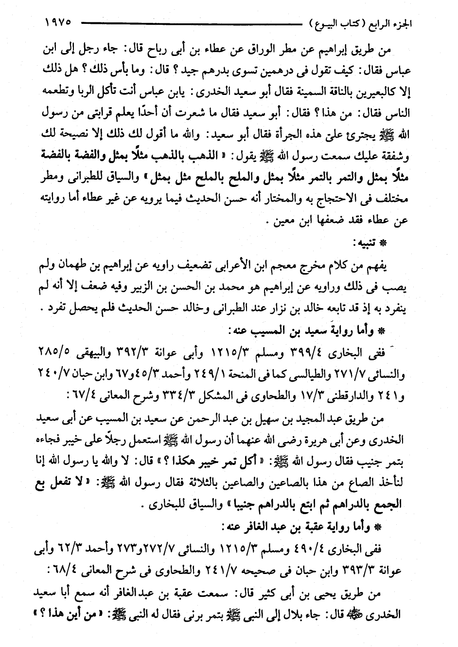 من طريق يحيى بن أبى كثير قال: سمعت عقبة بن عبد الغافر أنه سمع أبا سعيد الخدرى - رضي الله عنه - قال: جاء بلال إلى النبي - صلى الله عليه وسلم - بتمر برنى فقال له النبي - صلى الله عليه وسلم -: "من أين هذا؟ "