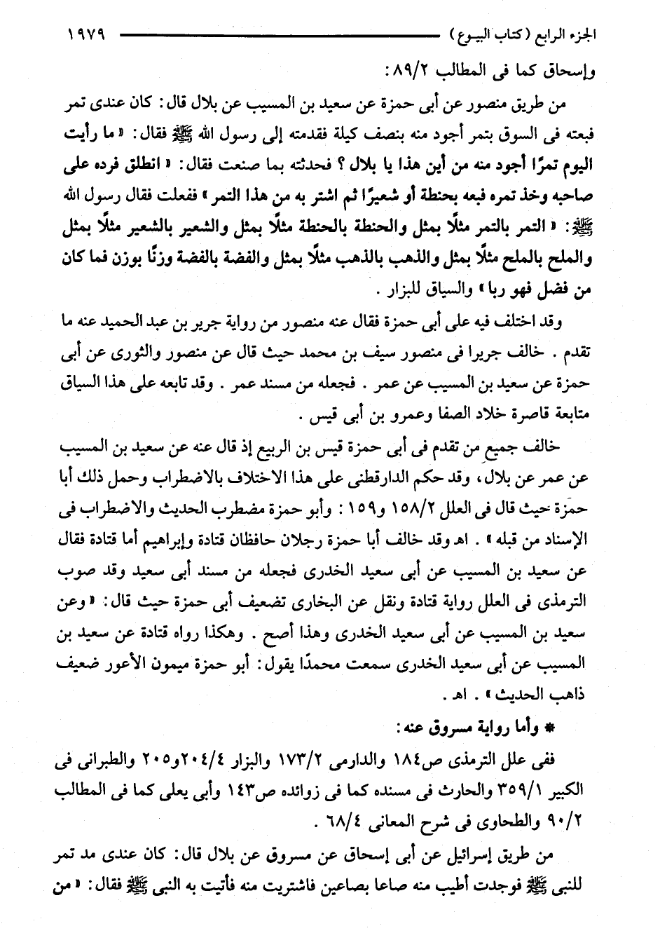من طريق إسرائيل عن أبى إسحاق عن مسروق عن بلال قال: كان عندى مد تمر للنبى - صلى الله عليه وسلم - فوجدت أطيب منه صاعا بصاعين فاشتريت منه فأتيت به النبي - صلى الله عليه وسلم - فقال: "من