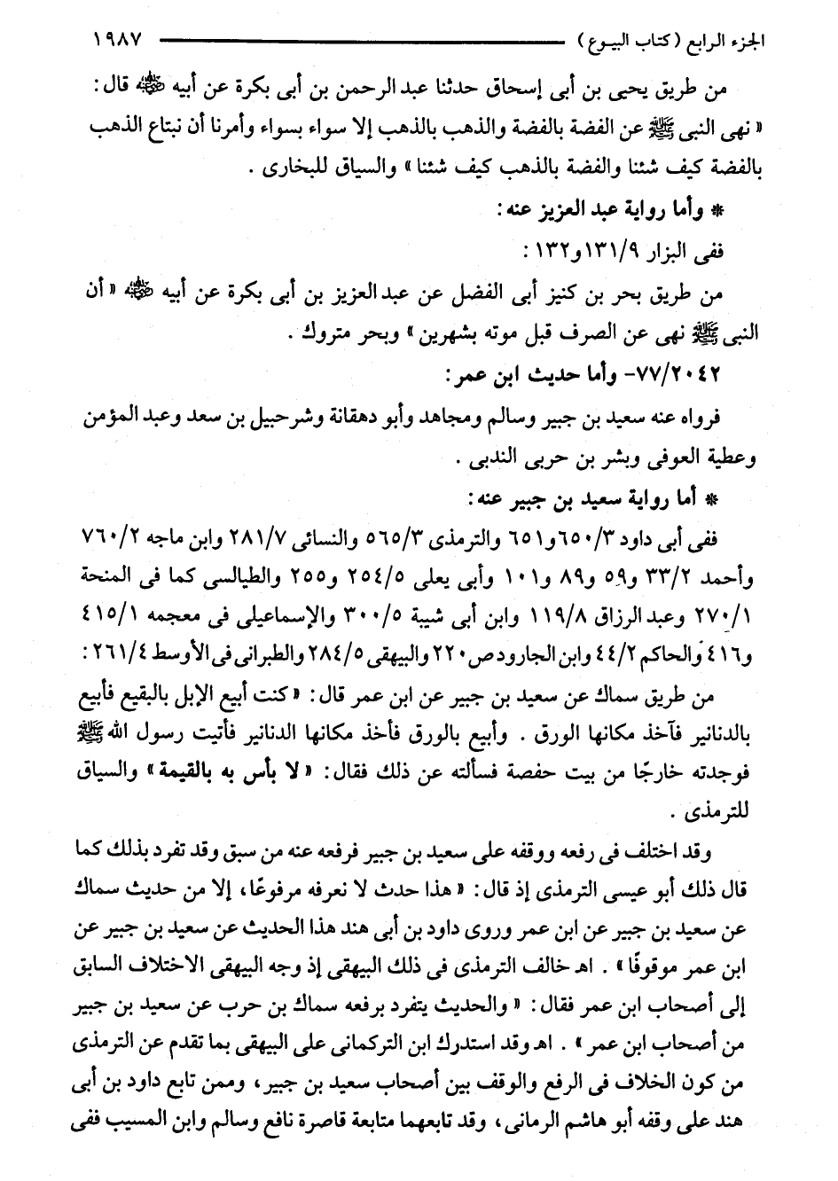 ففي أبى داود 3/ 650 و 651 والترمذي 3/ 565 والنسائي 7/ 281 وابن ماجه 2/ 760 وأحمد 2/ 33 و 59 و 89 و 101 وأبى يعلى 5/ 254 و 255 والطيالسى كما في المنحة 1/ 270 وعبد الرزاق 8/ 119 وابن أبى شيبة 5/ 300 والإسماعيلى في معجمه 1/ 415 و 416 والحاكم 2/ 44 وابن الجارود ص220 والبيهقي 5/ 284 والطبراني في الأوسط 4/ 261: