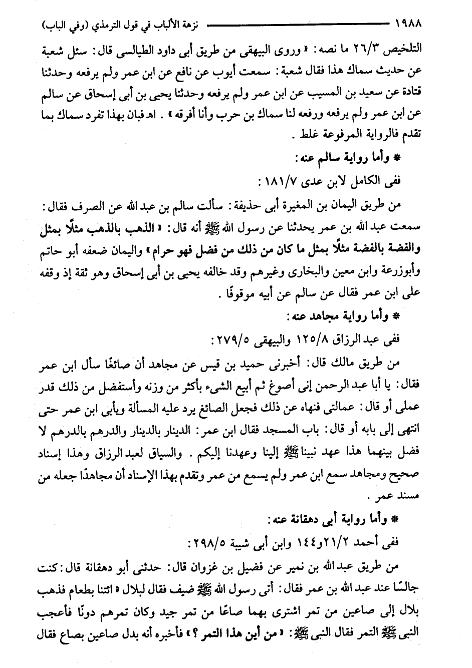 من طريق اليمان بن المغيرة أبى حذيفة: سألت سالم بن عبد الله عن الصرف فقال: سمعت عبد الله بن عمر يحدثنا عن رسول الله - صلى الله عليه وسلم - أنه قال: "الذهب بالذهب مثلًا بمثل والفضة بالفضة مثلًا بمثل ما كان من ذلك من فضل فهو حرام" واليمان ضعفه أبو حاتم وأبو زرعة وابن معين والبخاري وغيرهم وقد خالفه يحيى بن أبى إسحاق وهو ثقة إذ وقفه على ابن عمر فقال عن سالم عن أبيه موقوفًا.