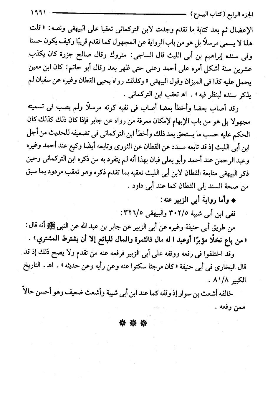 وقد أصاب بعضا وأخطأ بعضا أصاب في نفيه كونه مرسلاً ولم يصب في تسميته مجهولا بل هو من باب الإبهام لإمكان معرفة من رواه عن جابر فإذا كان ذلك كذلك كان الحكم عليه حسب ما يستحق بعد ذلك وأخطأ ابن التركمانى في تضعيفه للحديث من أجل ابن أبى الليث إذ قد تابعه مسدد عن القطان عن الثورى وتابعه أيضًا وكيع عند أحمد وغيره وعبد الرحمن عند أحمد وأبو يعلى فبان بهذا أنه لم يتفرد به من ذكره ابن التركمانى وحين ذكر البيهقي متابعة القطان لابن أبى الليث تعقبه بما تقدم ذكره وهو تعقب مردود بما سبق من صحة السند إلى القطان كما عند أبى داود.