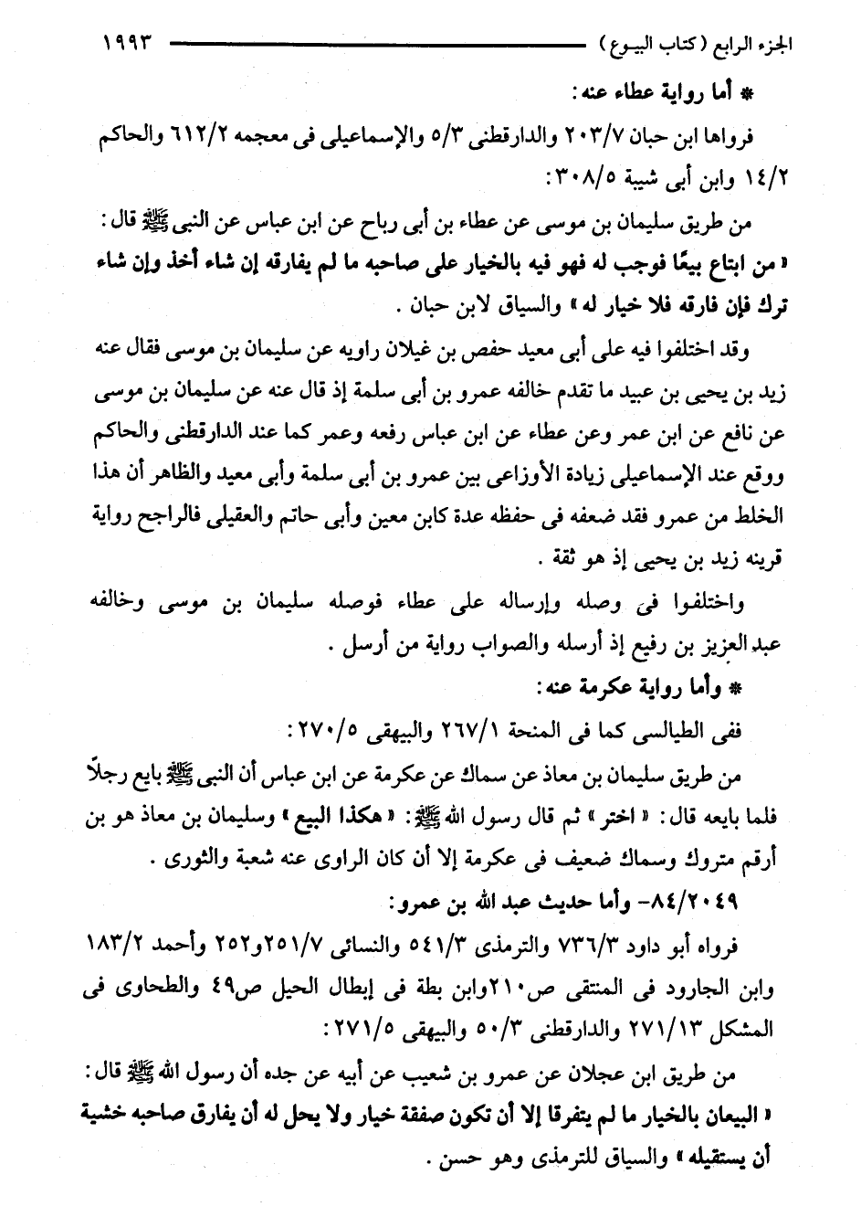من طريق سليمان بن معاذ عن سماك عن عكرمة عن ابن عباس أن النبي - صلى الله عليه وسلم - بايع رجلاً فلما بايعه قال: " اختر " ثم قال رسول الله - صلى الله عليه وسلم -: "هكذا البيع" وسليمان بن معاذ هو بن أرقم متروك وسماك ضعيف في عكرمة إلا أن كان الراوى عنه شعبة والثورى.