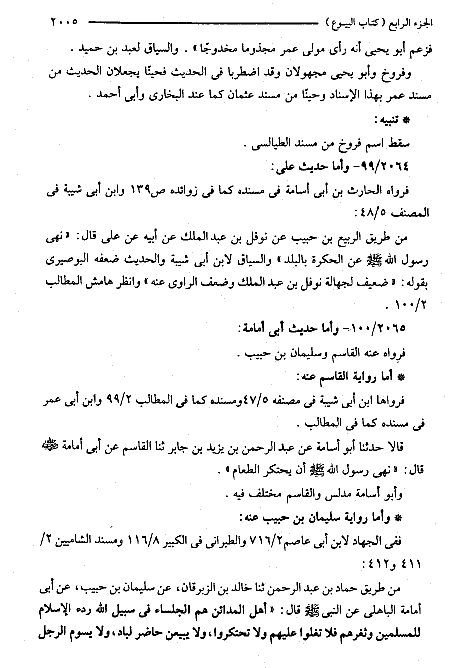 قالا حدثنا أبو أسامة عن عبد الرحمن بن يزيد بن جابر ثنا القاسم عن أبى أمامة - رضي الله عنه - قال: "نهى رسول الله - صلى الله عليه وسلم - أن يحتكر الطعام".